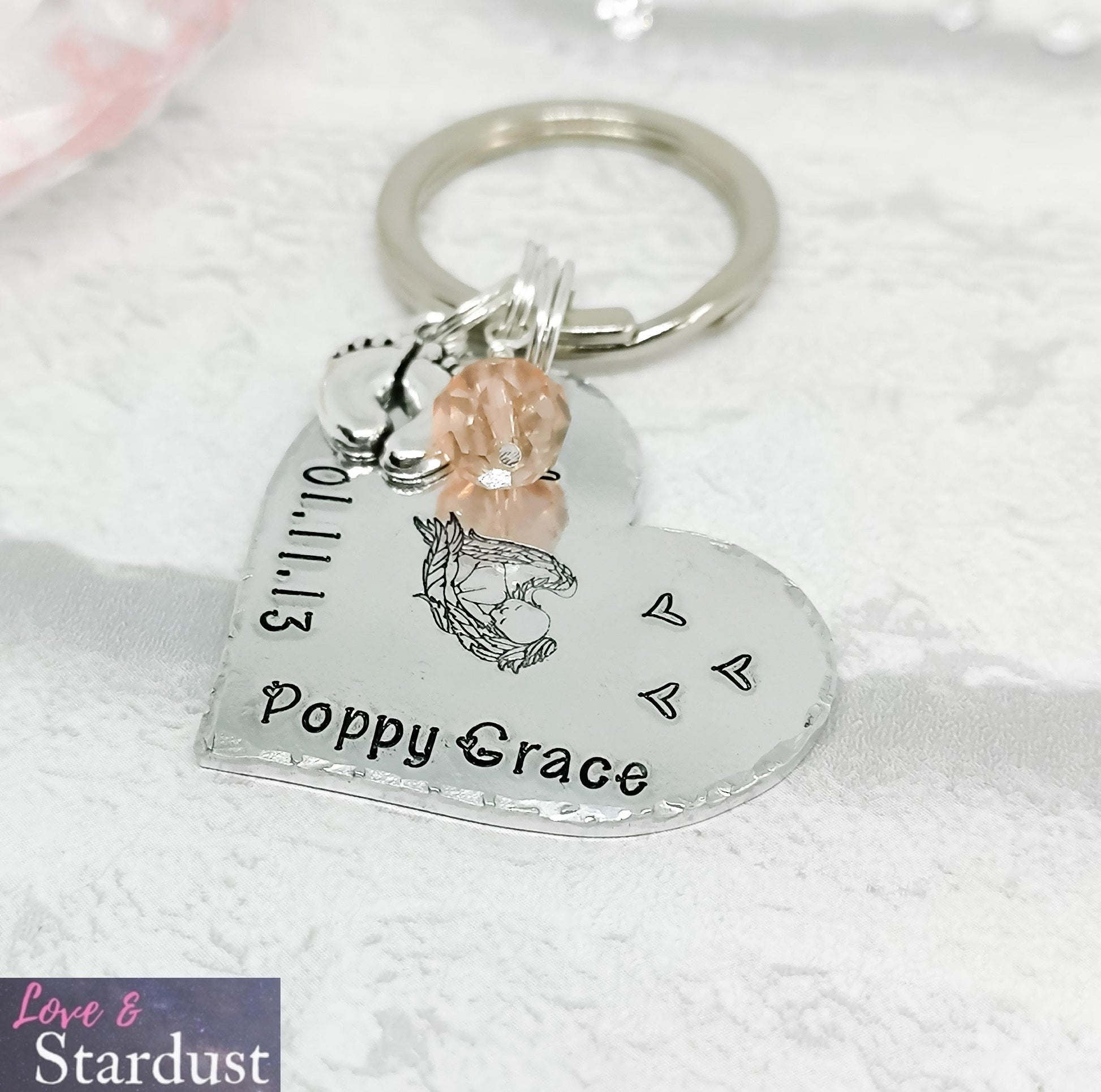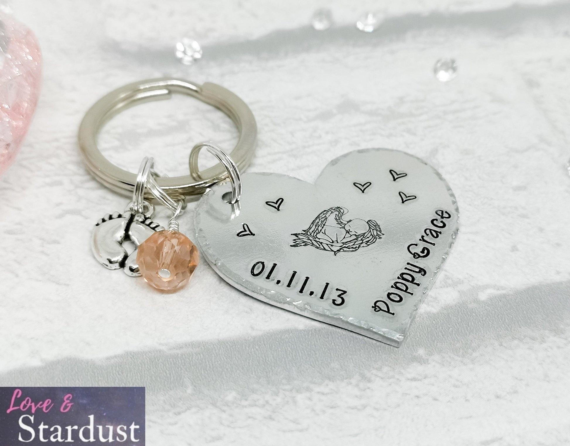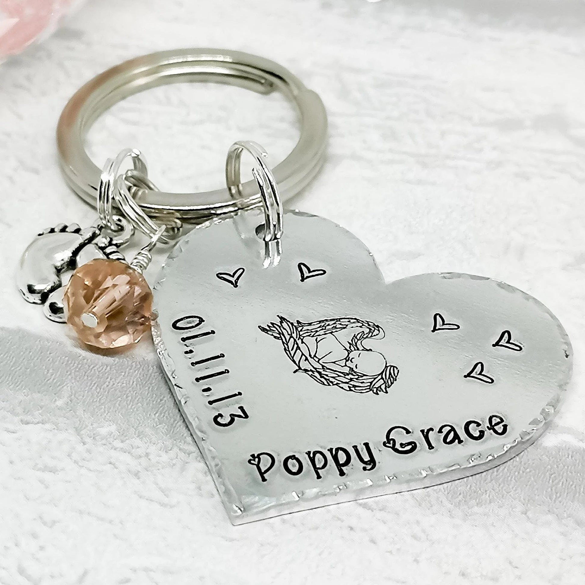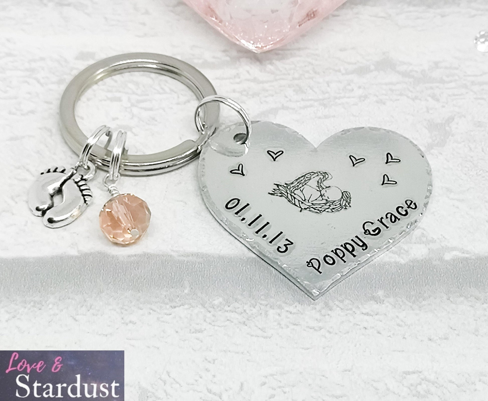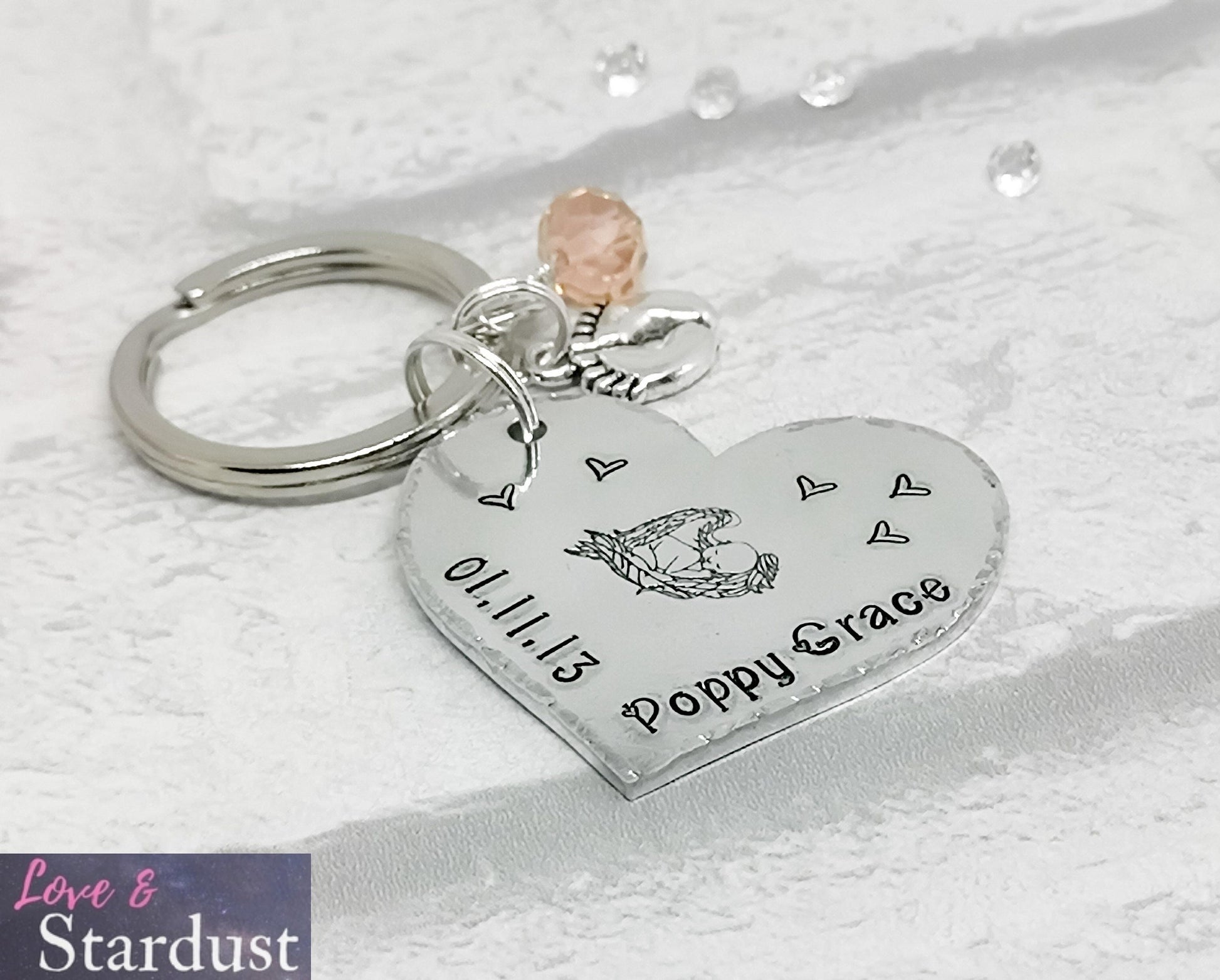 Beautiful hand-stamped Heart Keyring with a baby design and personalised with a date and name, with charm & crystal