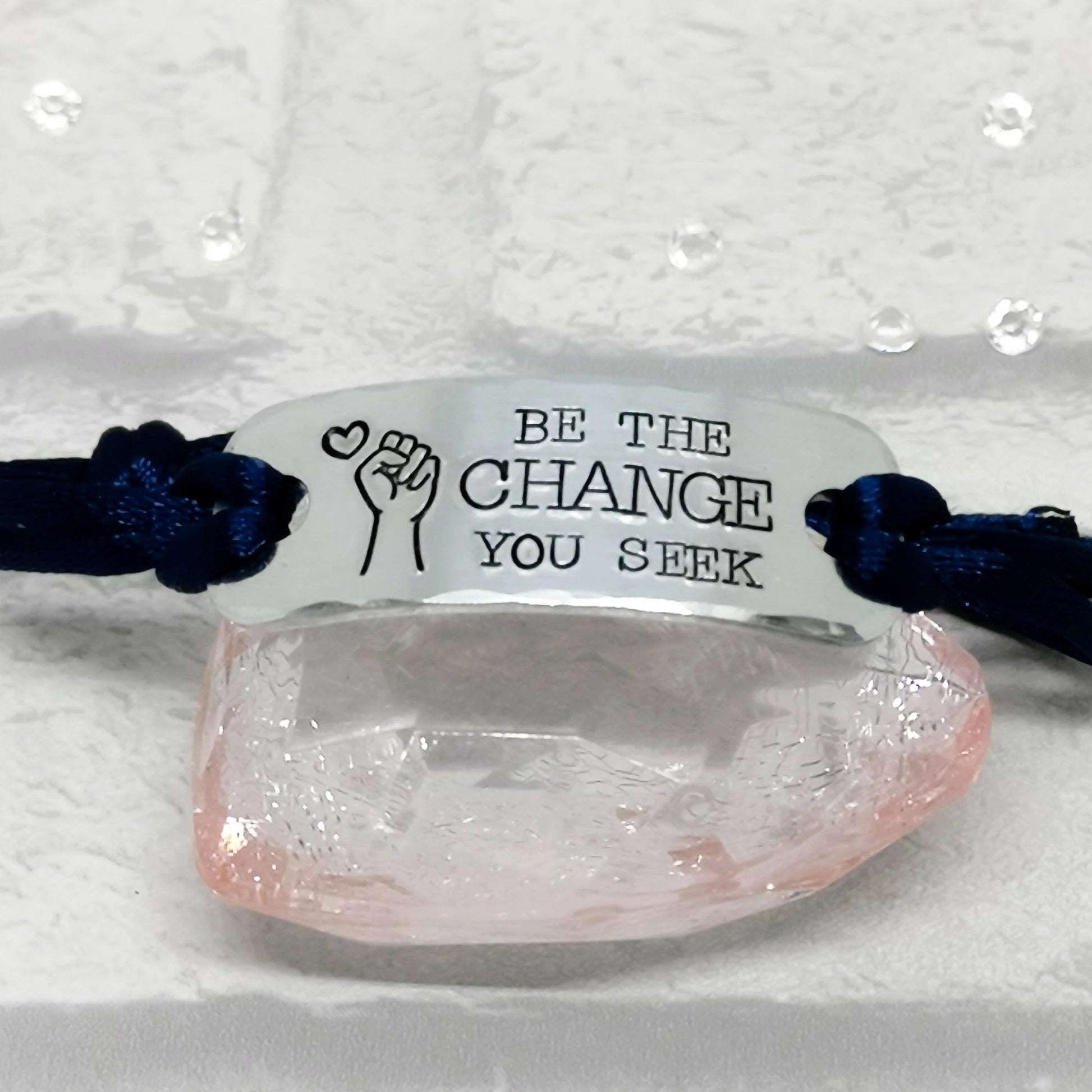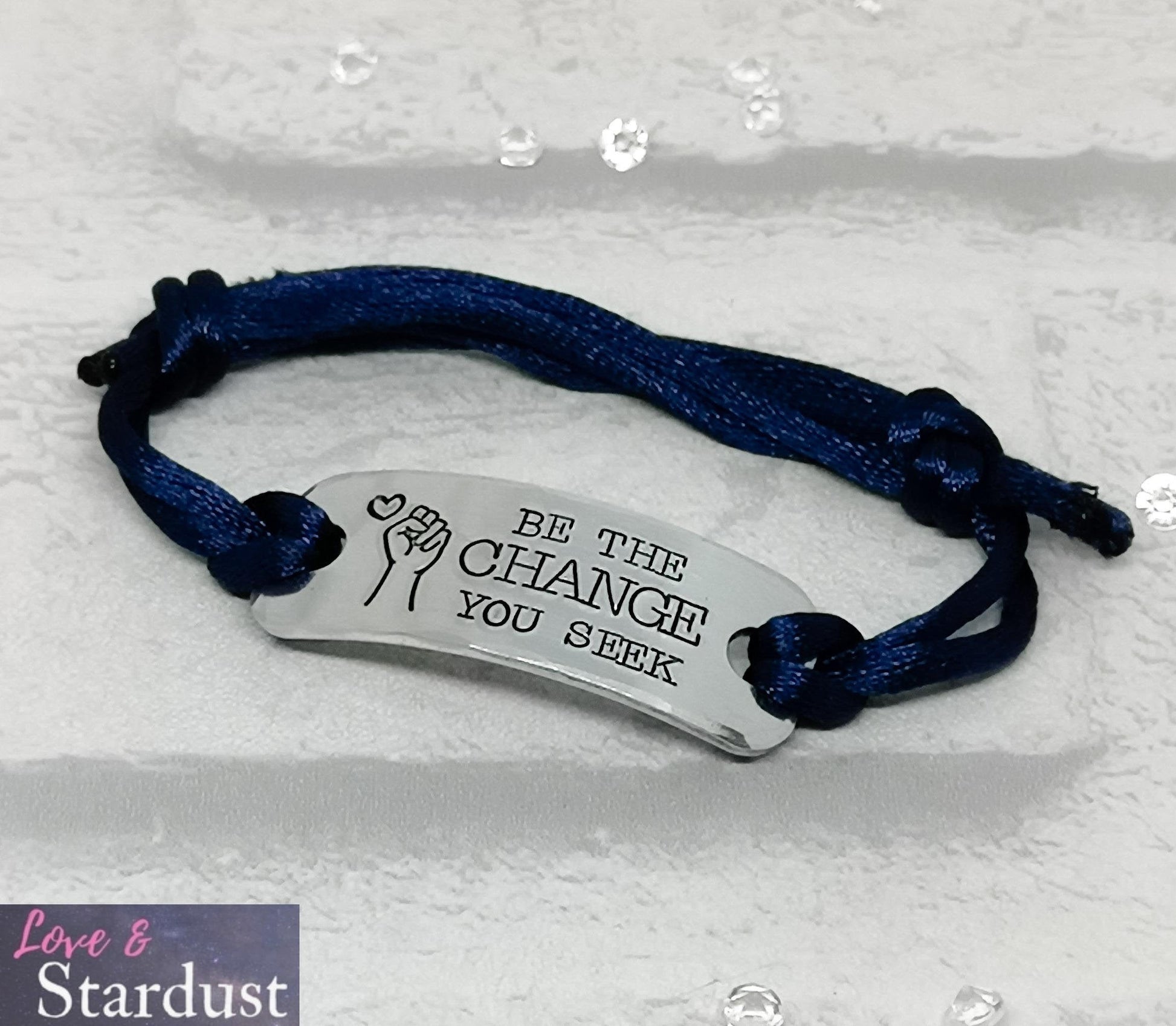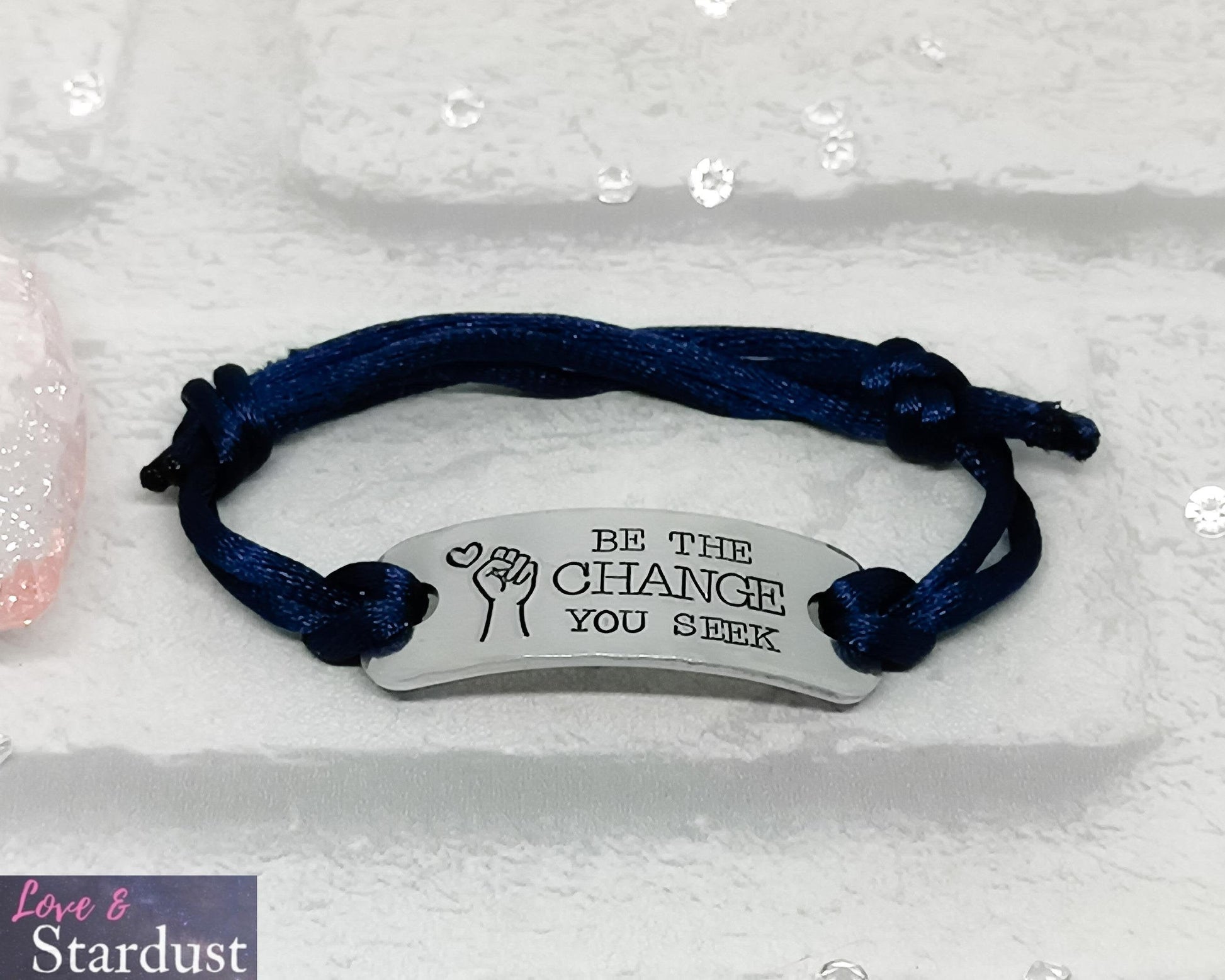 Satin corded adjustable slider bracelet with the quote BE THE CHANGE YOU SEEK and a hand/fist design