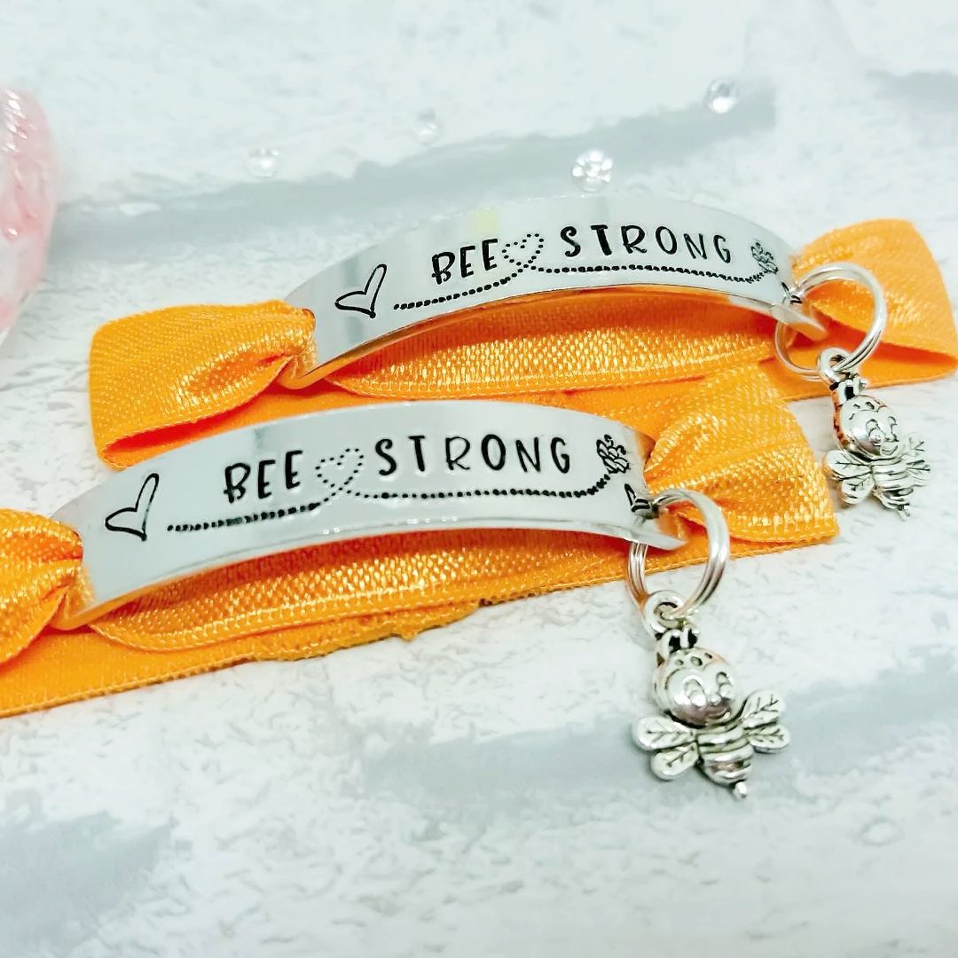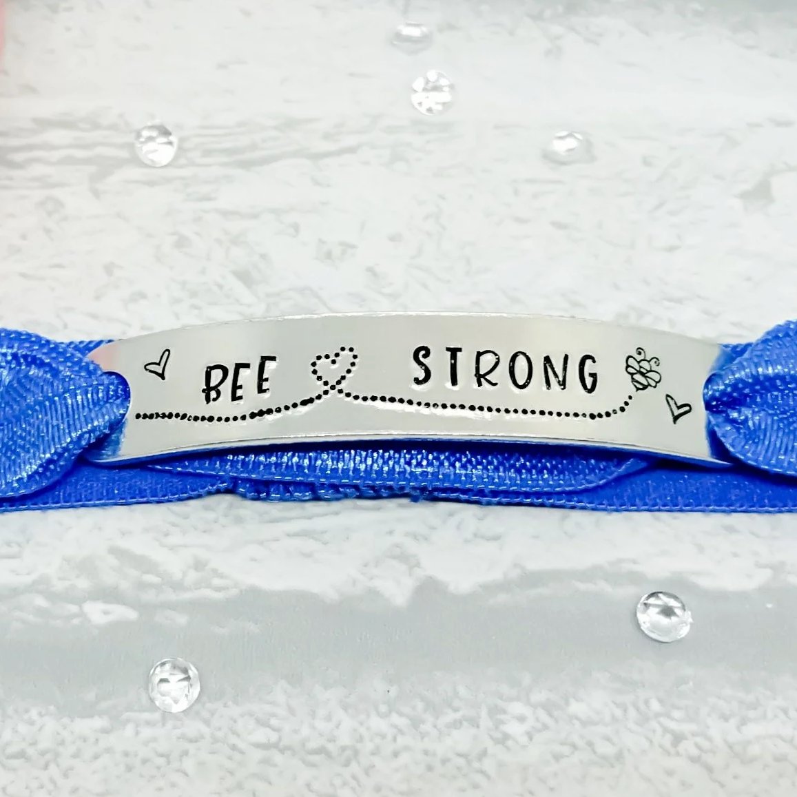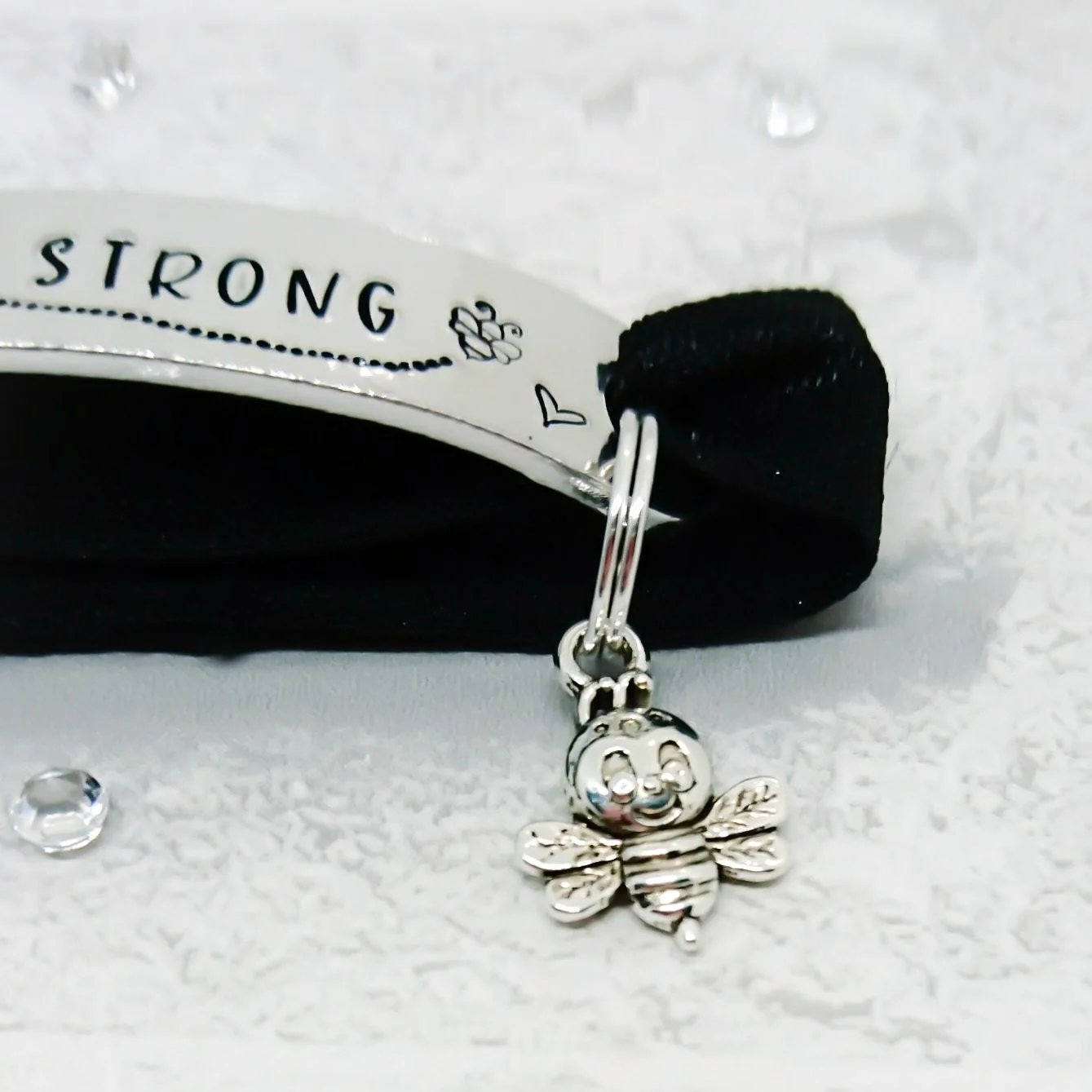 Hand Stamped Bracelet with the quote BEE STRONG on an soft elasticated band with optional Bee charm