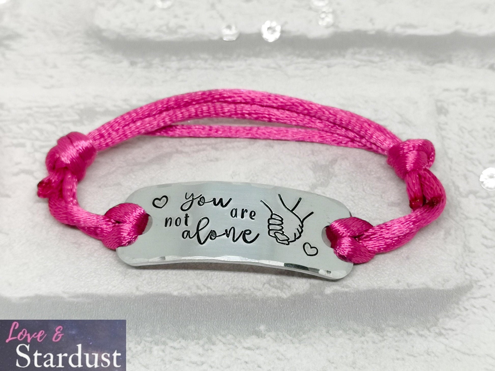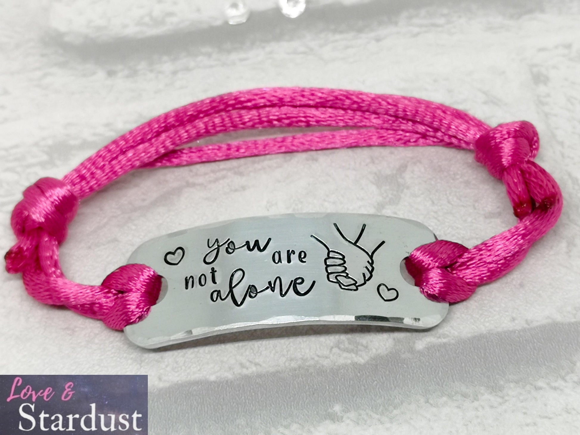 Satin corded adjustable slider bracelet with the quote YOU ARE NOT ALONE and a holding hands design