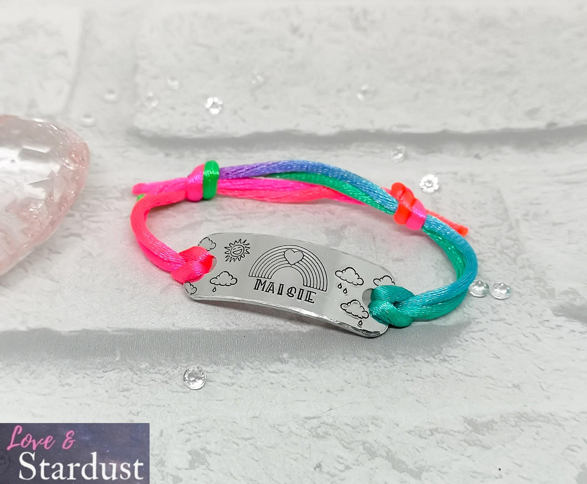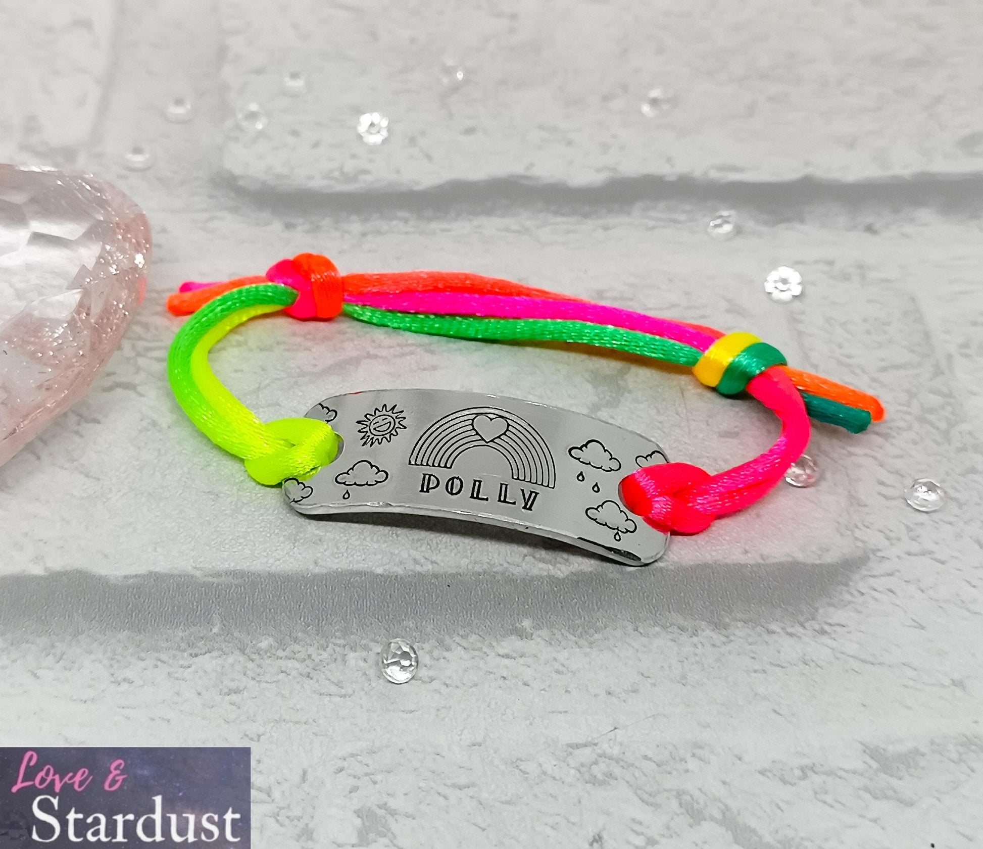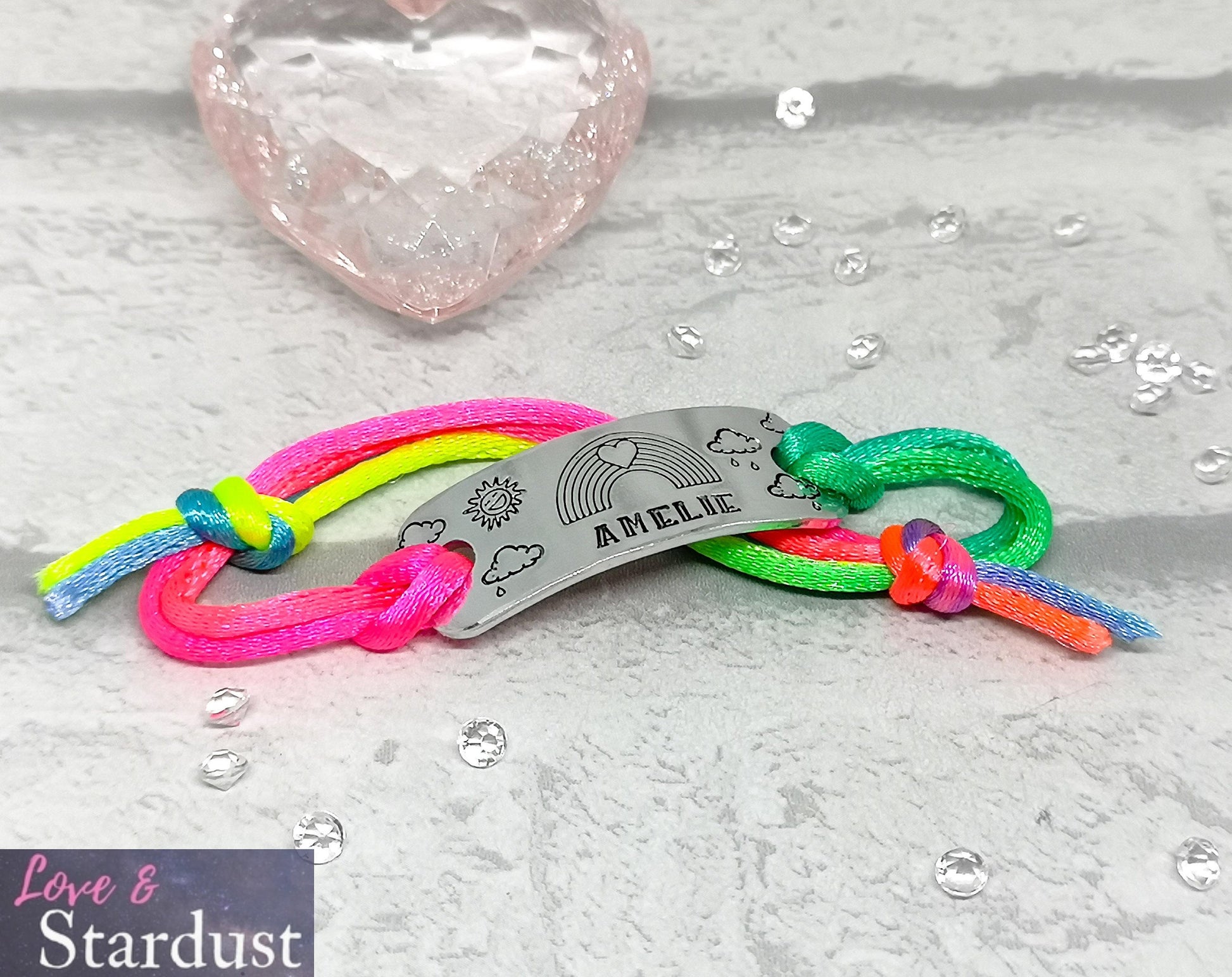 Satin corded adjustable slider bracelet with the a Rainbow design, personalised with the name of your choice