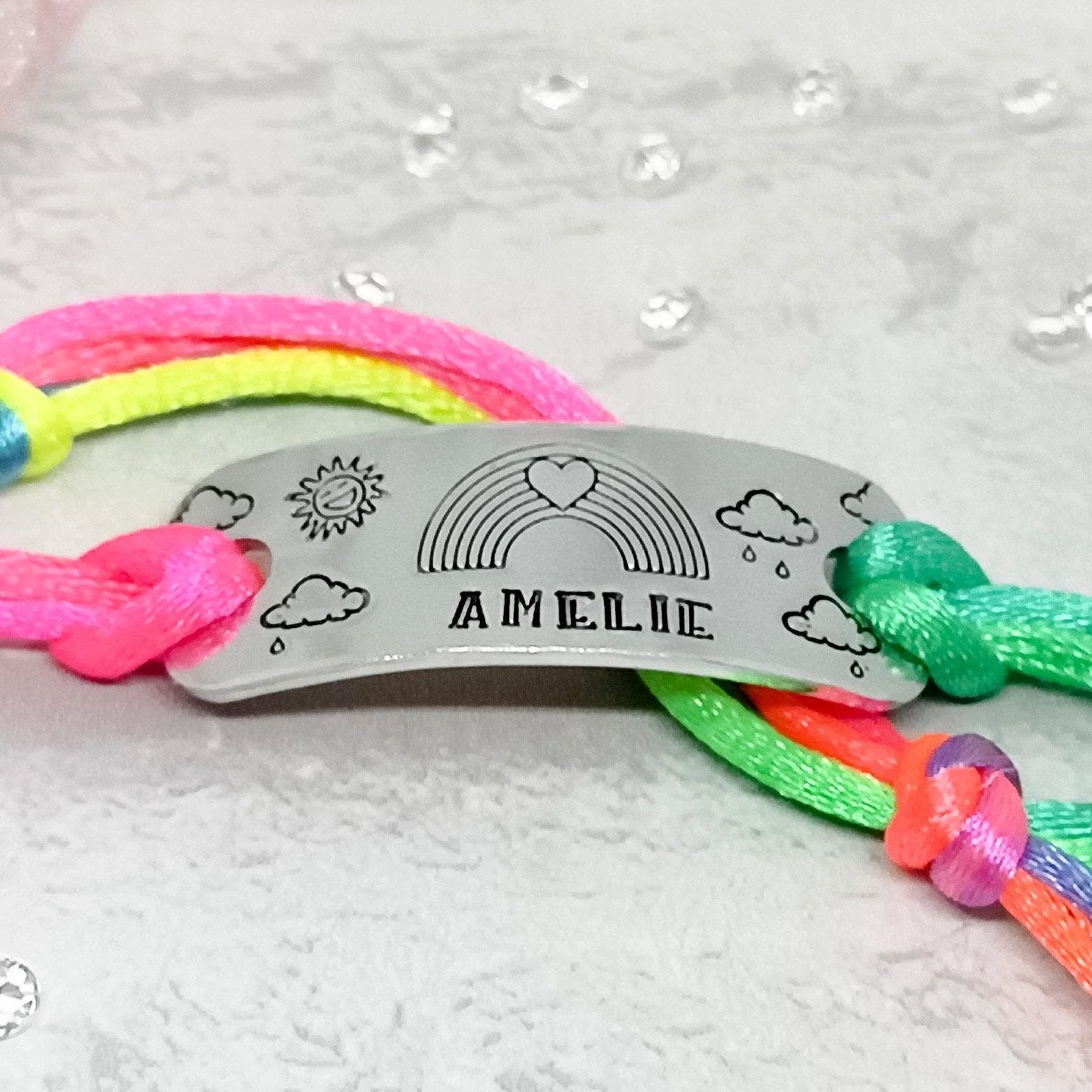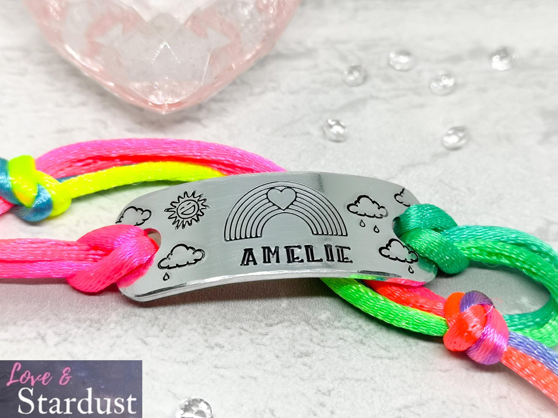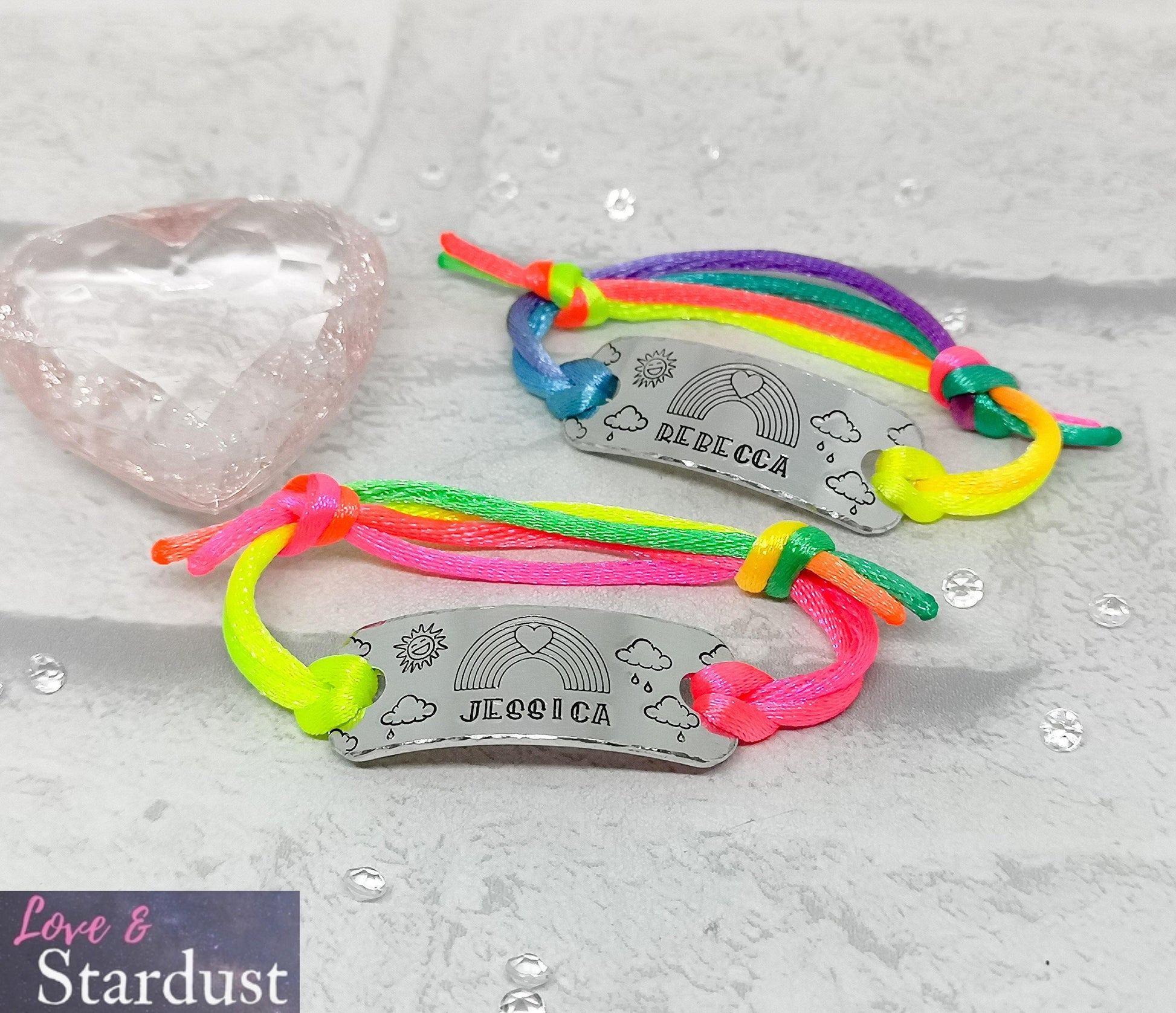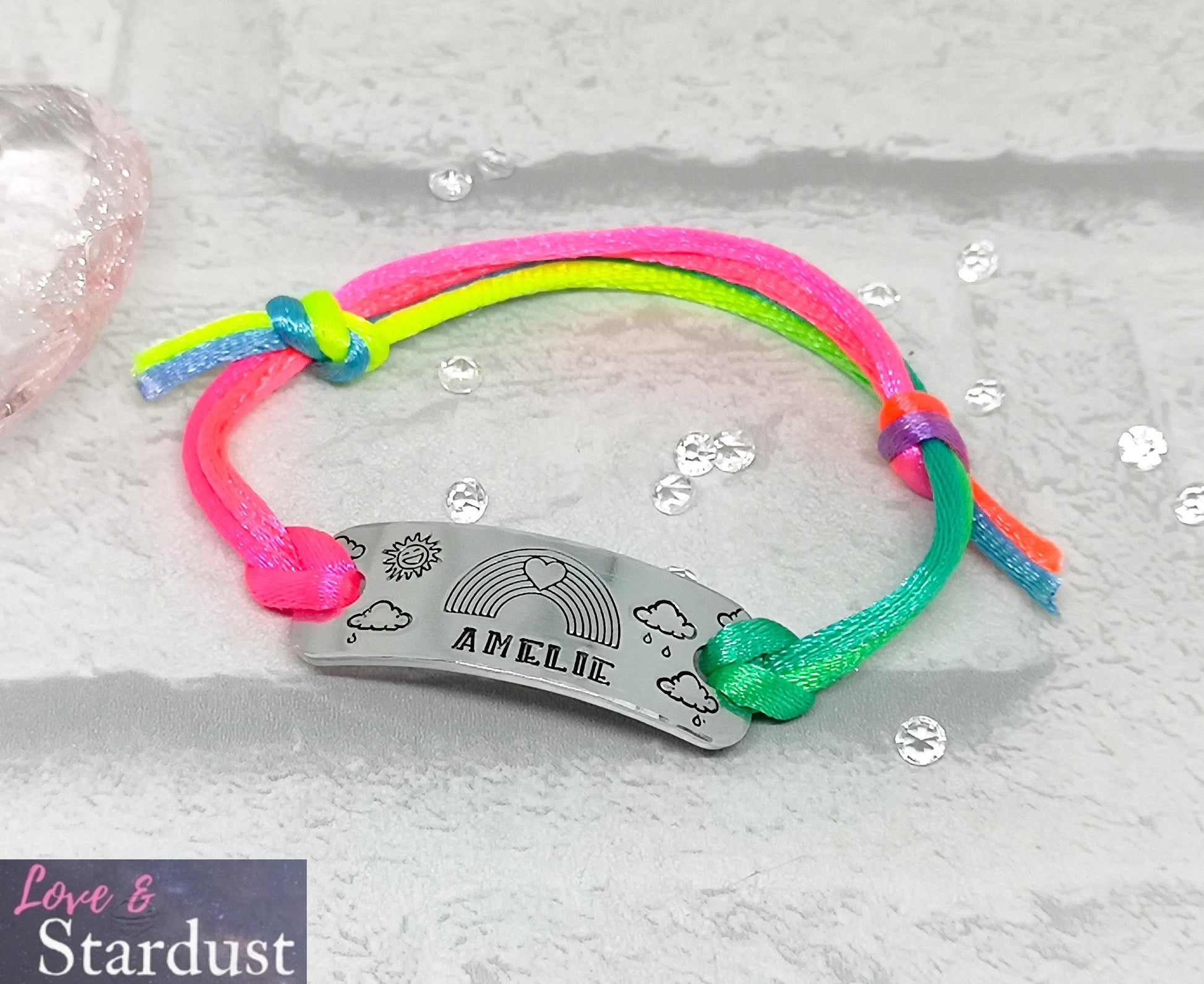 Satin corded adjustable slider bracelet with the a Rainbow design, personalised with the name of your choice
