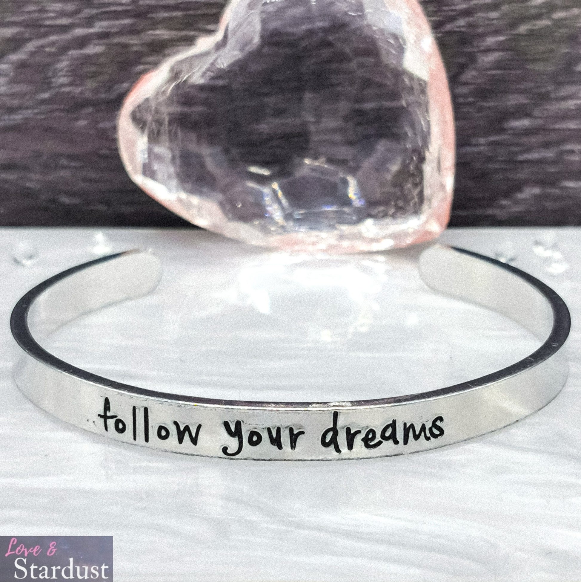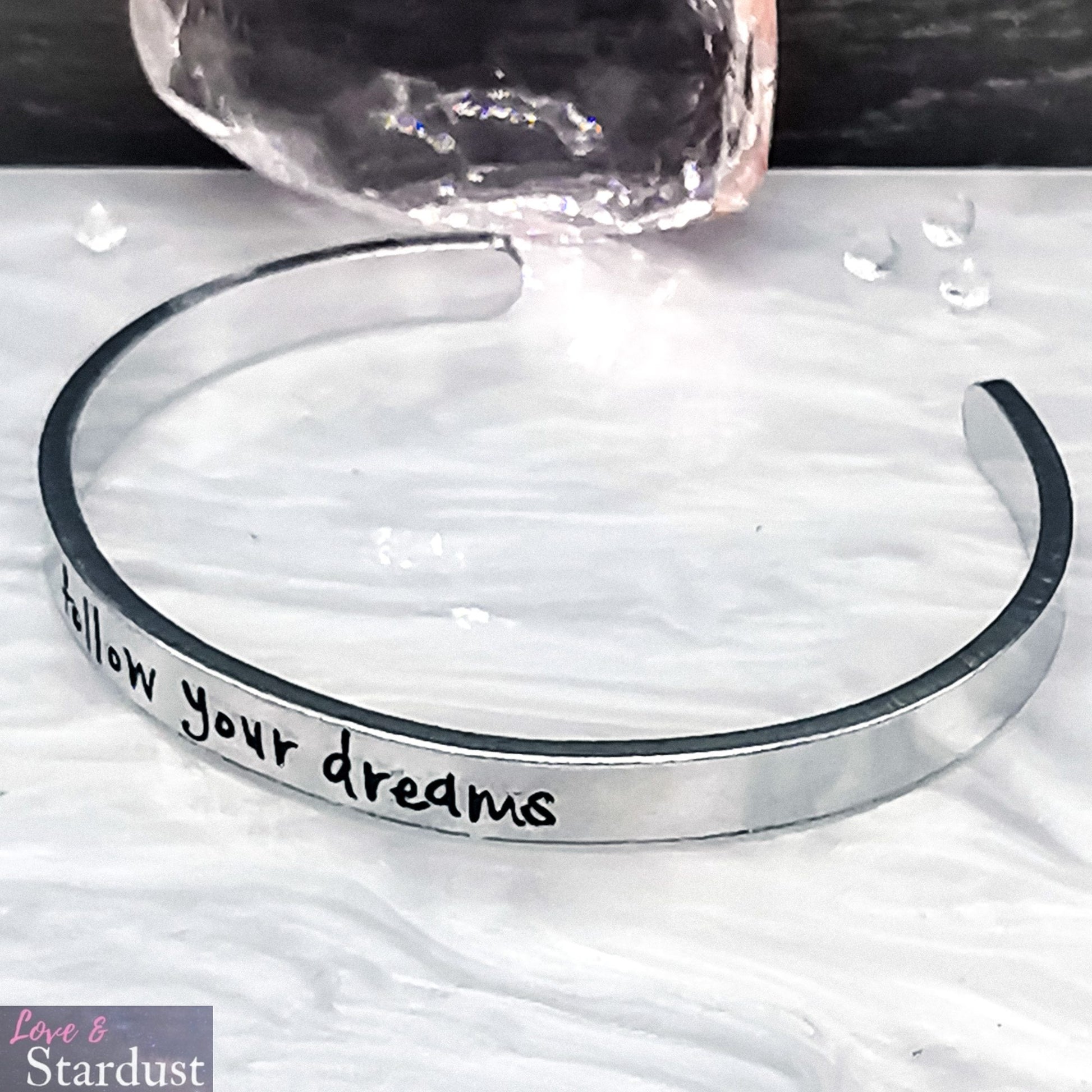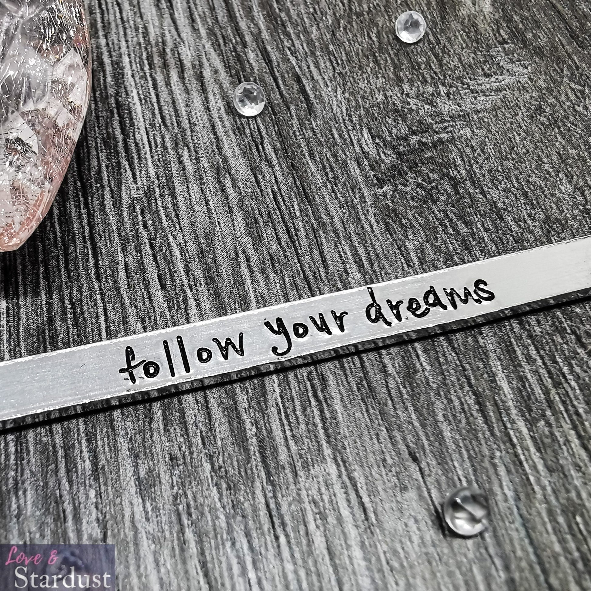Lightweight Aluminium Skinny Cuff Bangle with the quote "Follow your dreams"