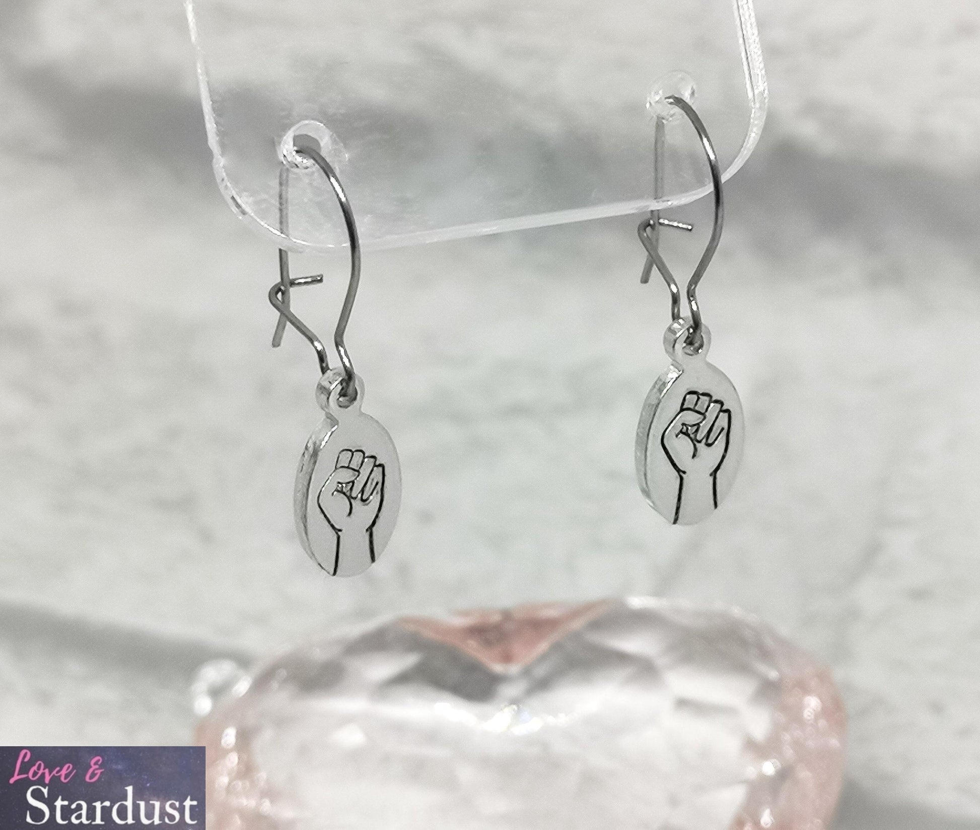 Hypo-allergenic Surgical Steel wires with hand-stamped drop tag with a HAND FIST design
