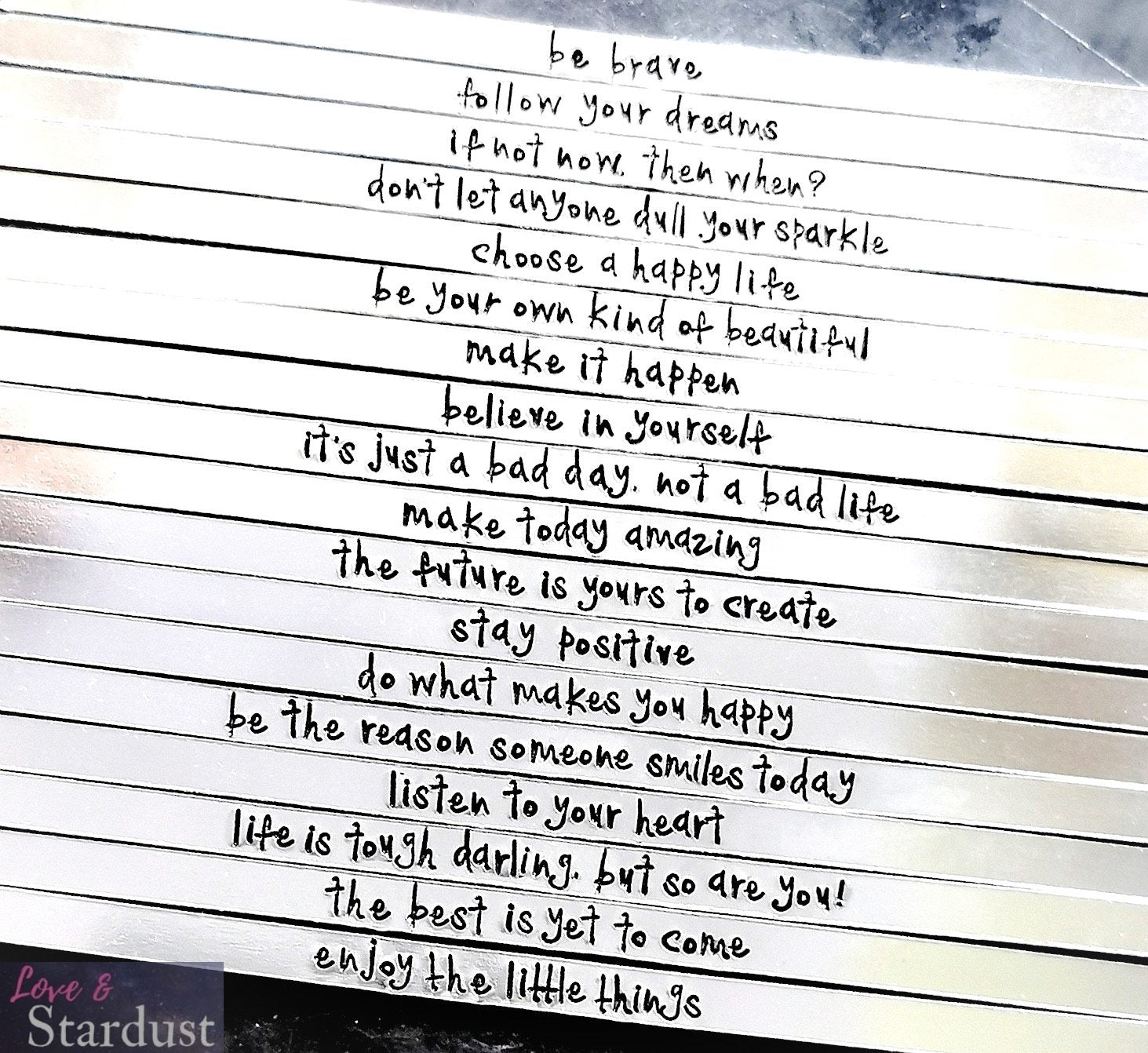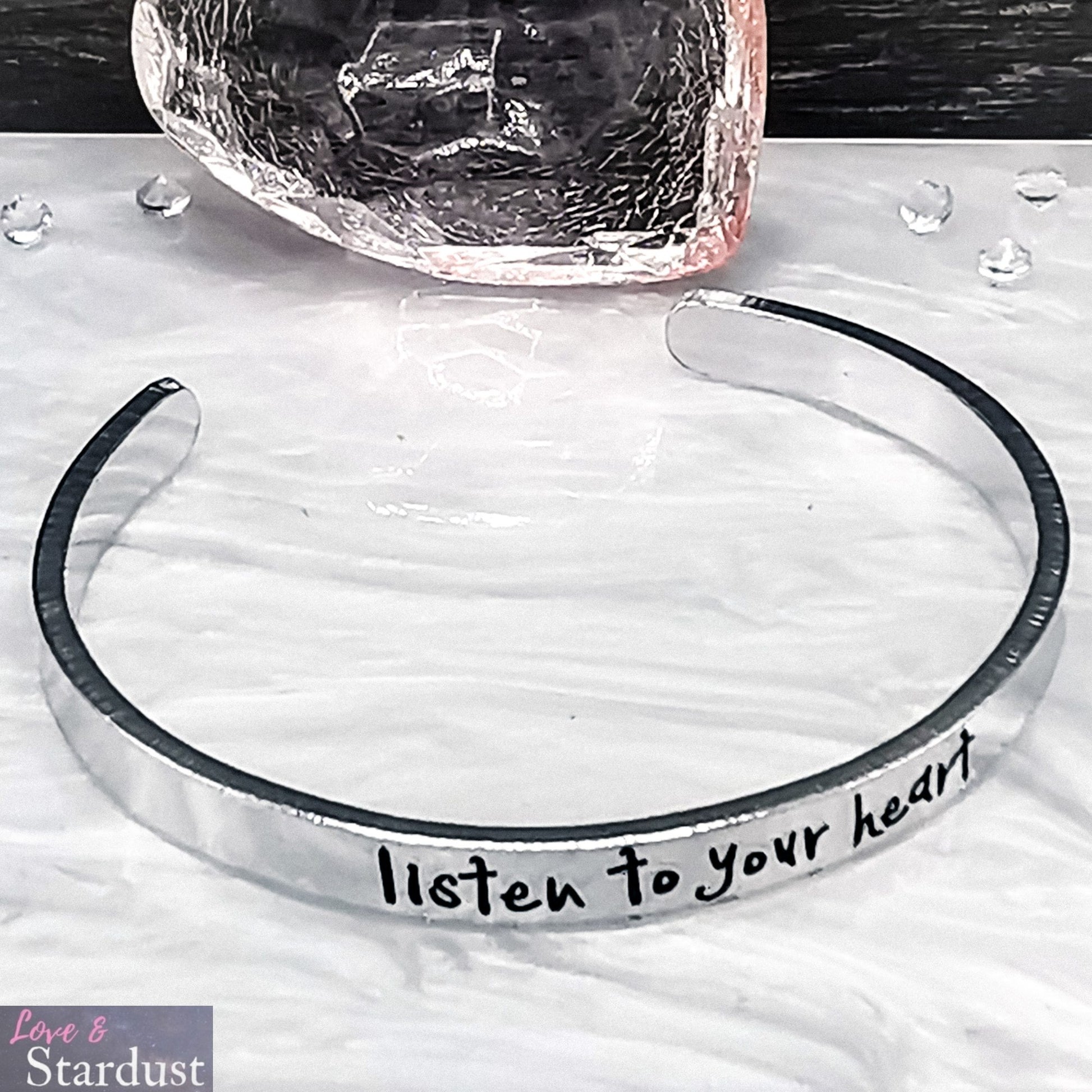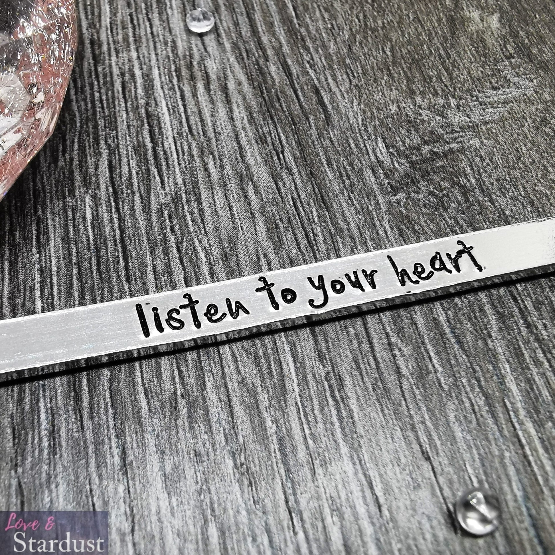 Lightweight Aluminium Skinny Cuff Bangle with the quote "listen to your heart"