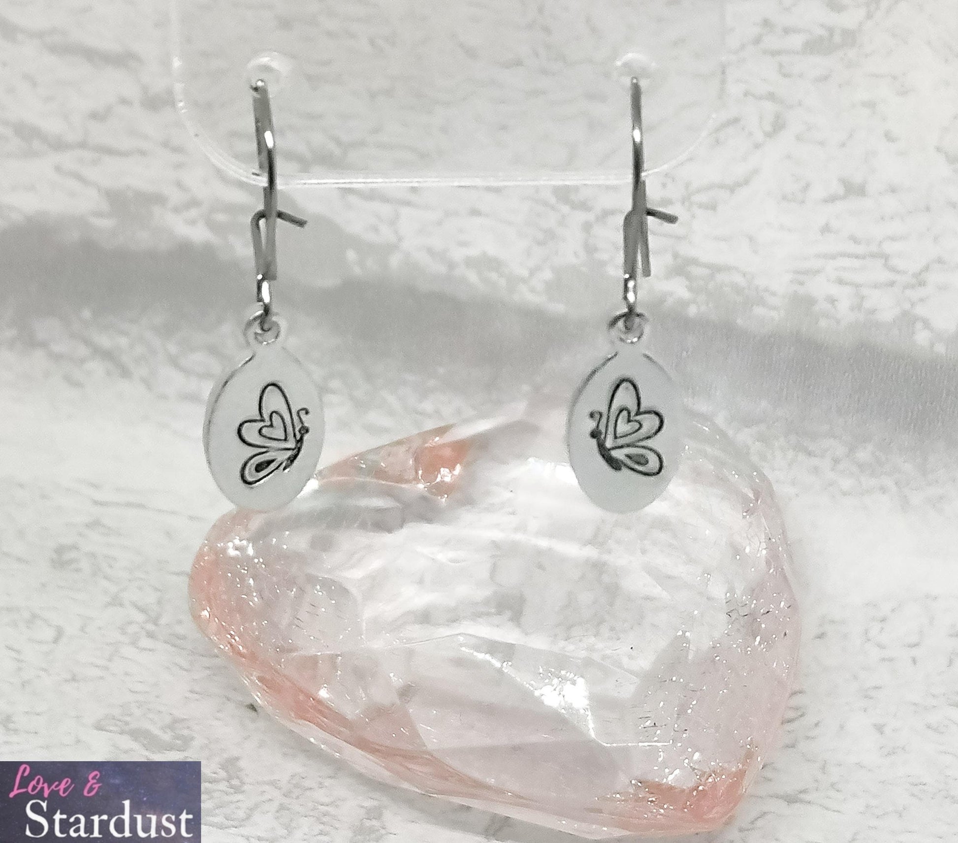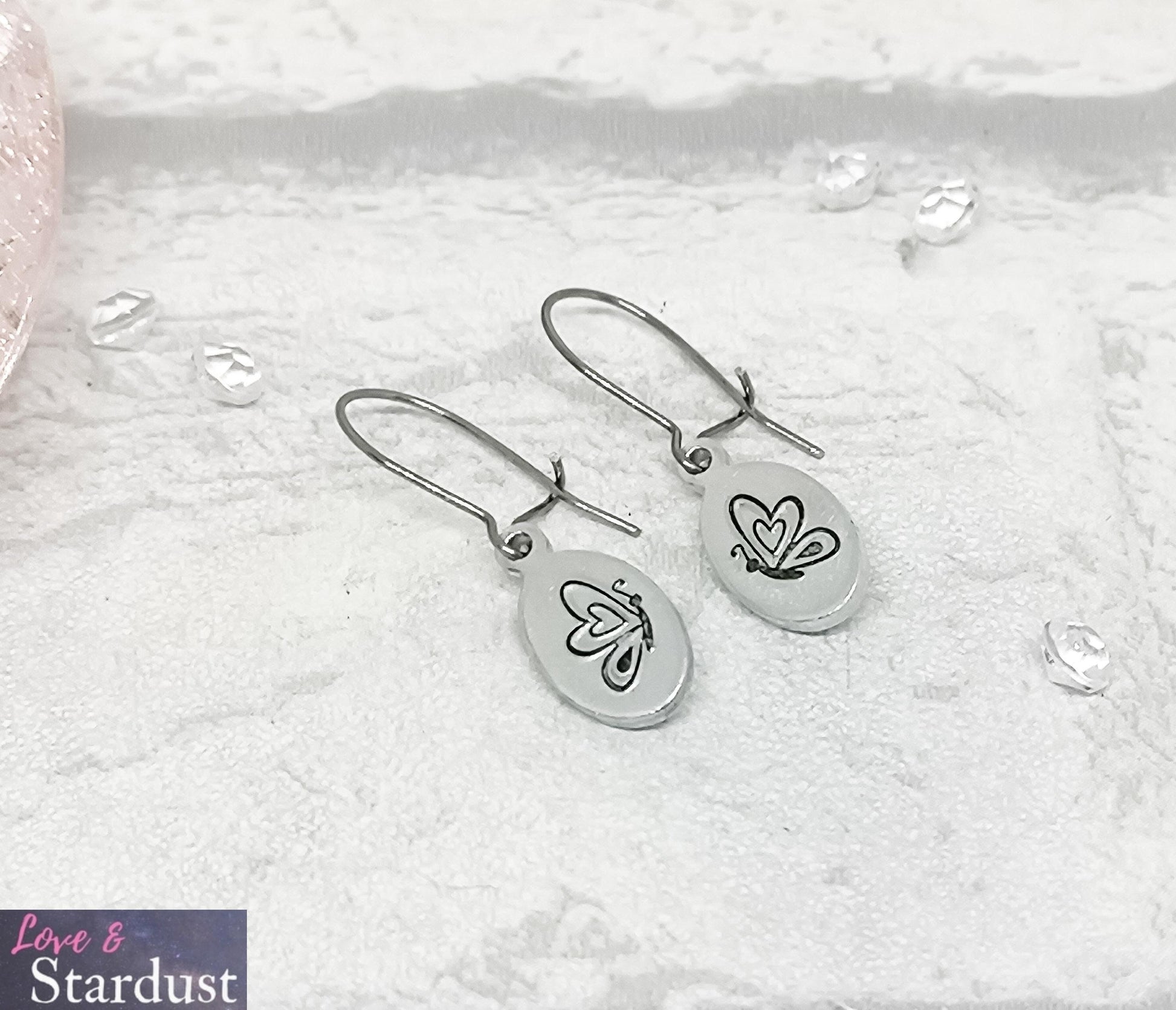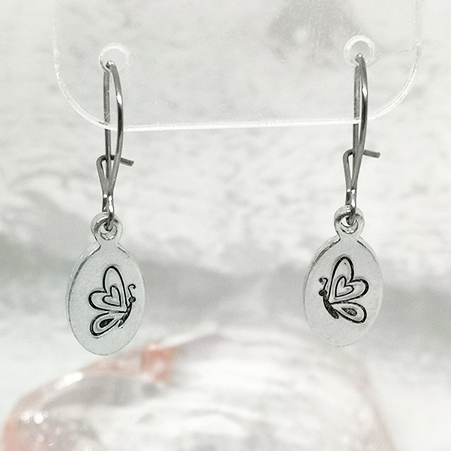 Hypo-allergenic Surgical Steel wires with hand-stamped drop tag with a BUTTERFLY FLUTTERBY design