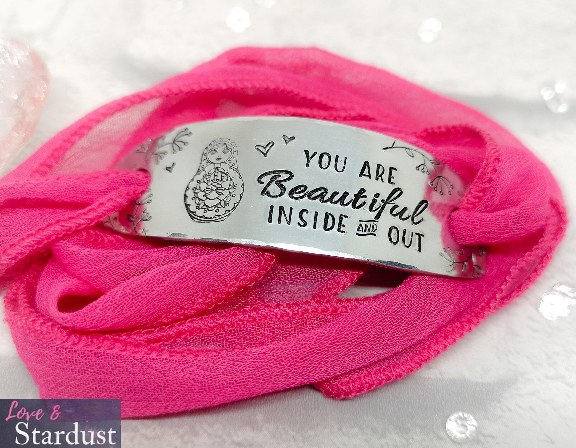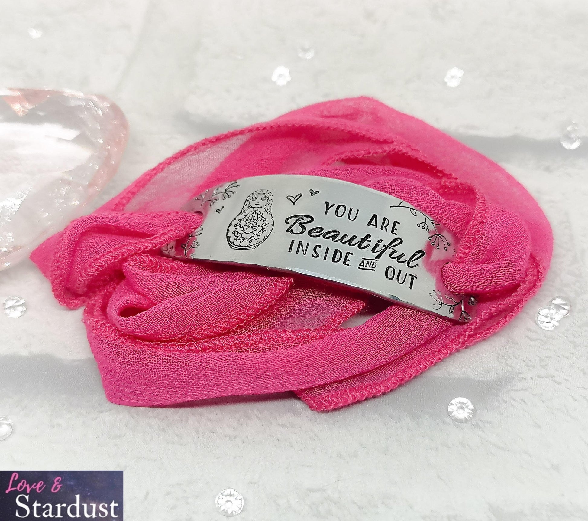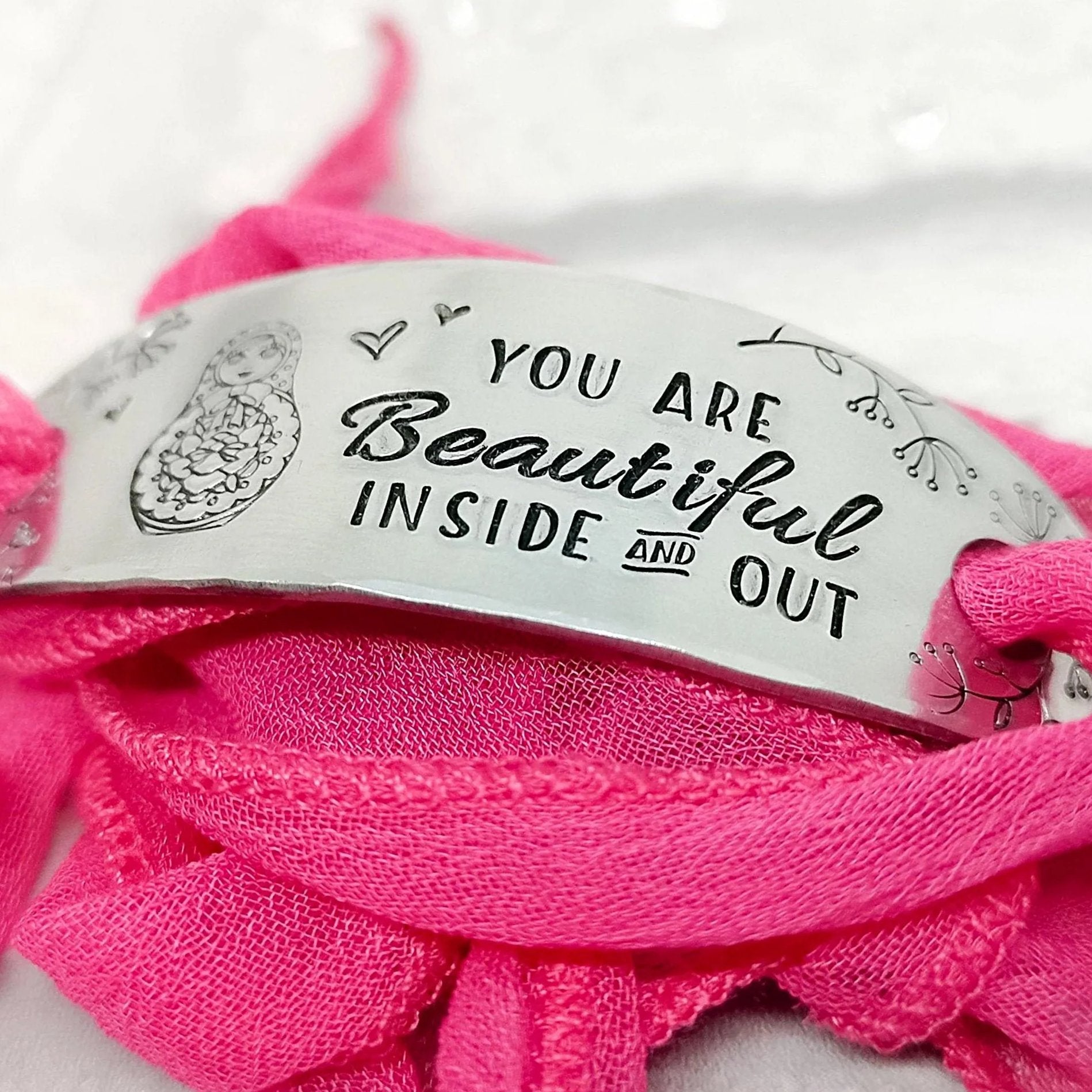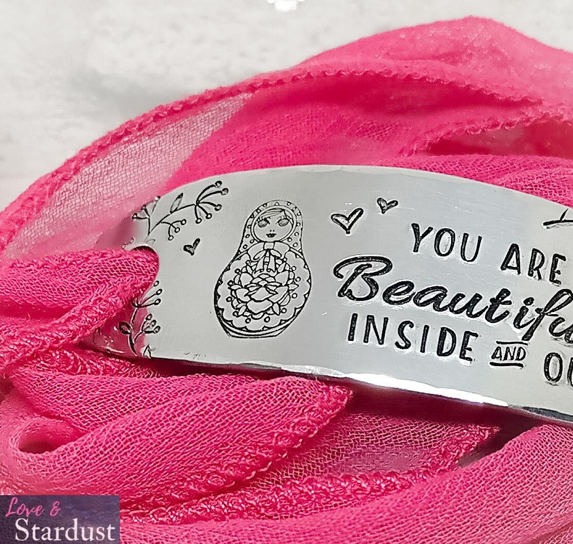 Silk Ribbon Wrap Bracelet with the quote YOU ARE BEAUTIFUL INSIDE & OUT with Russian Doll & Floral design