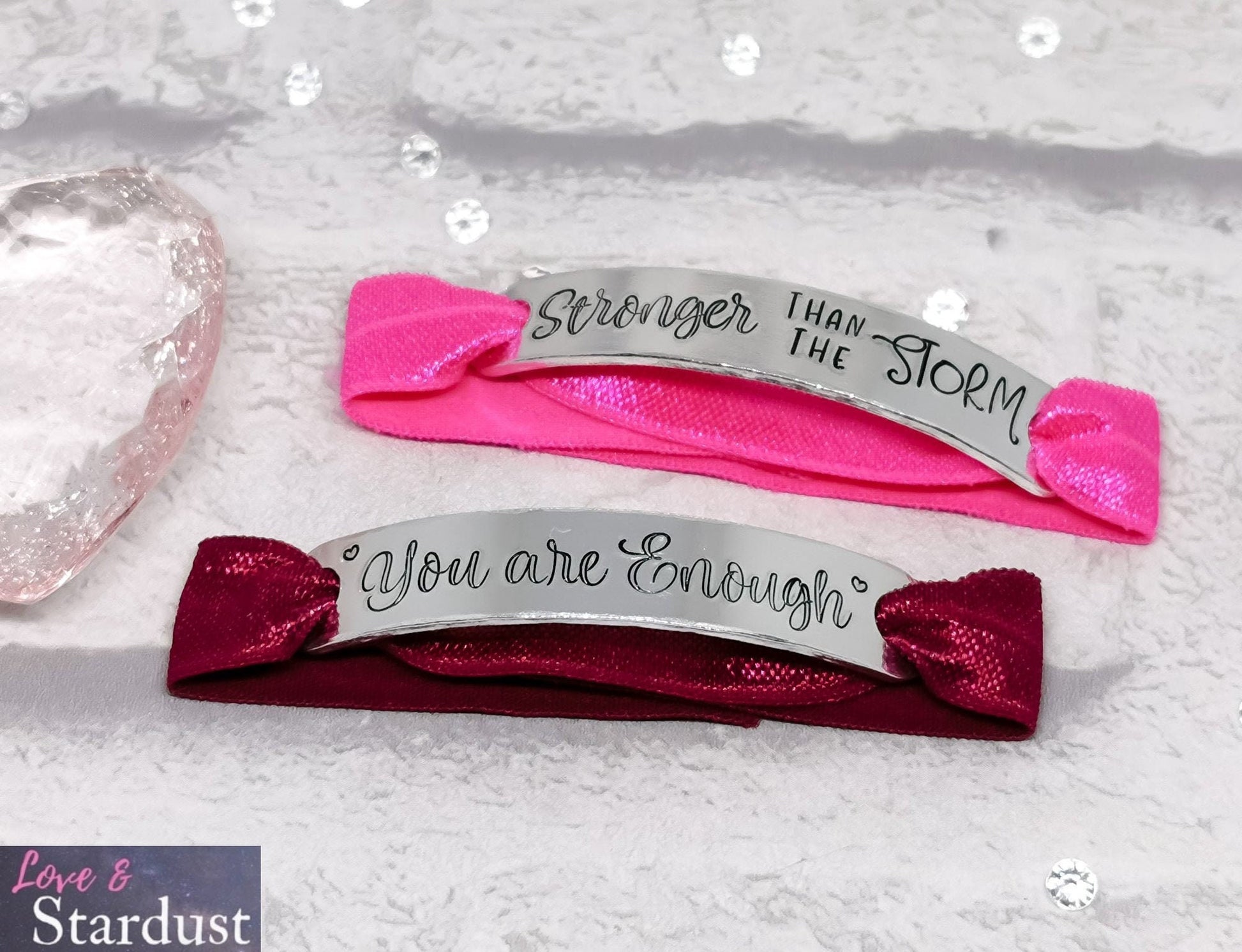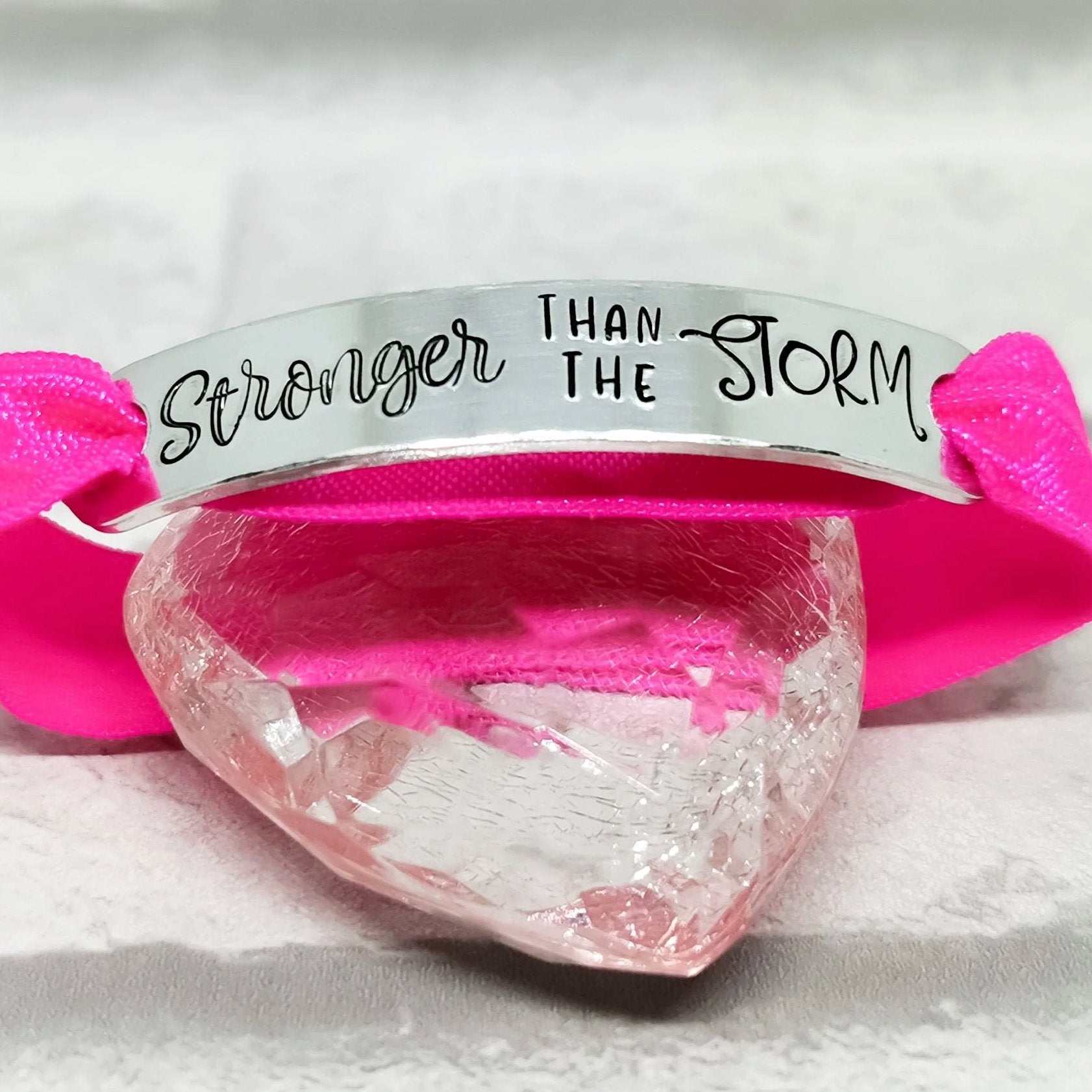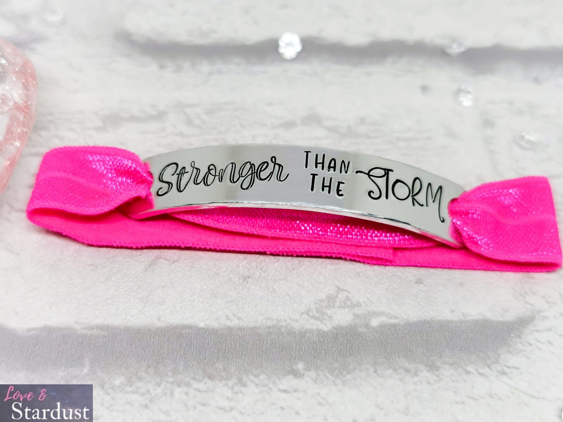 Hand Stamped Bracelet with the quote STRONGER THAN THE STORM on an soft elasticated band