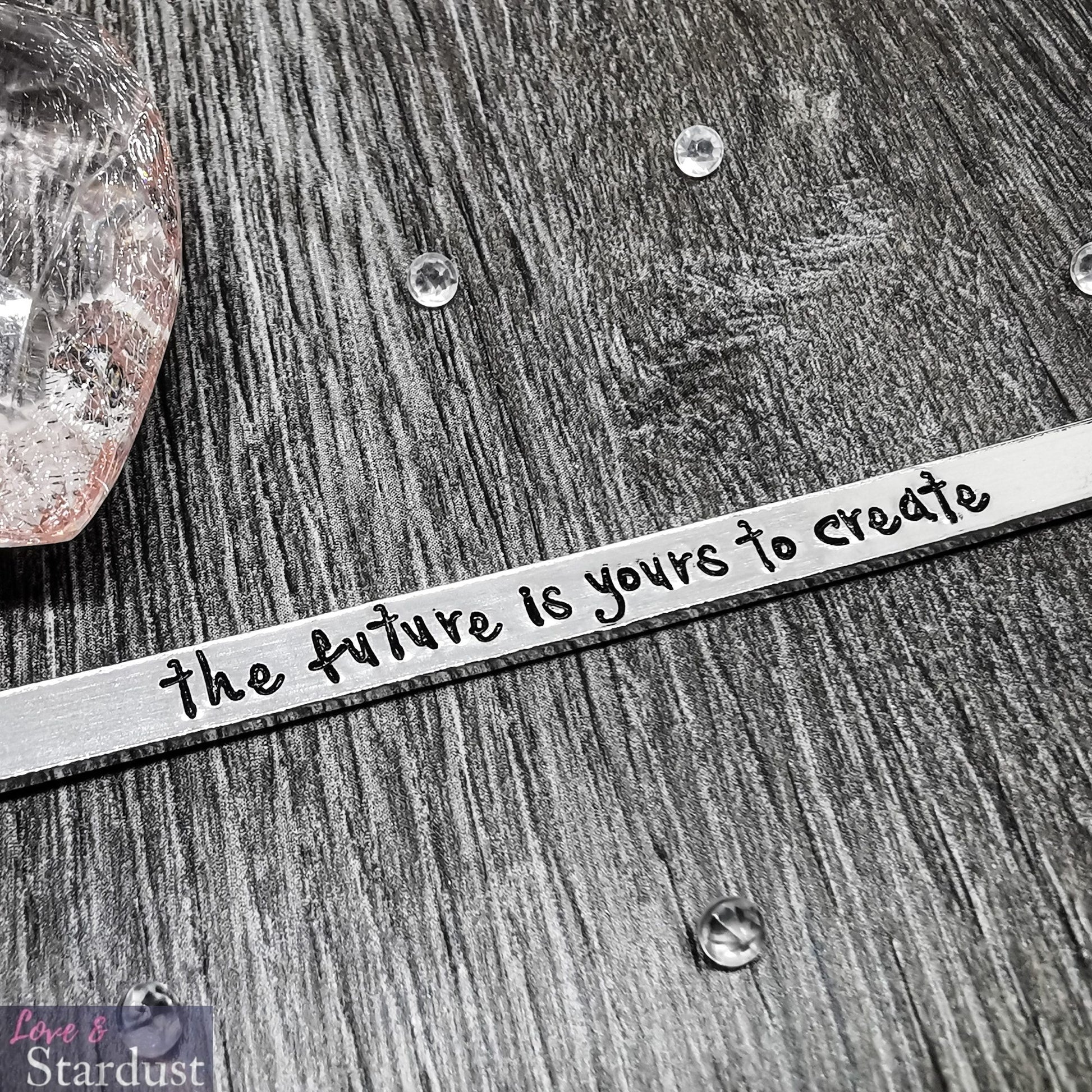 Lightweight Aluminium Skinny Cuff Bangle with the quote "the future is yours to create"