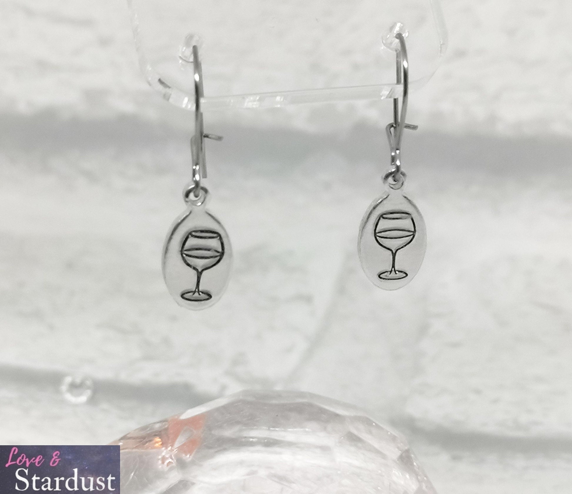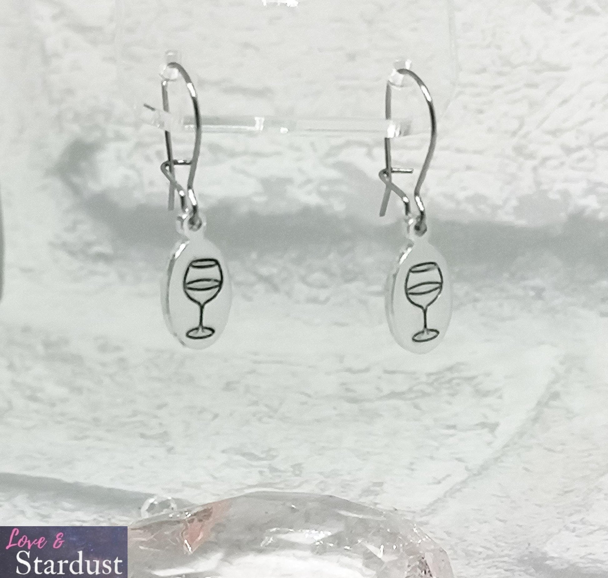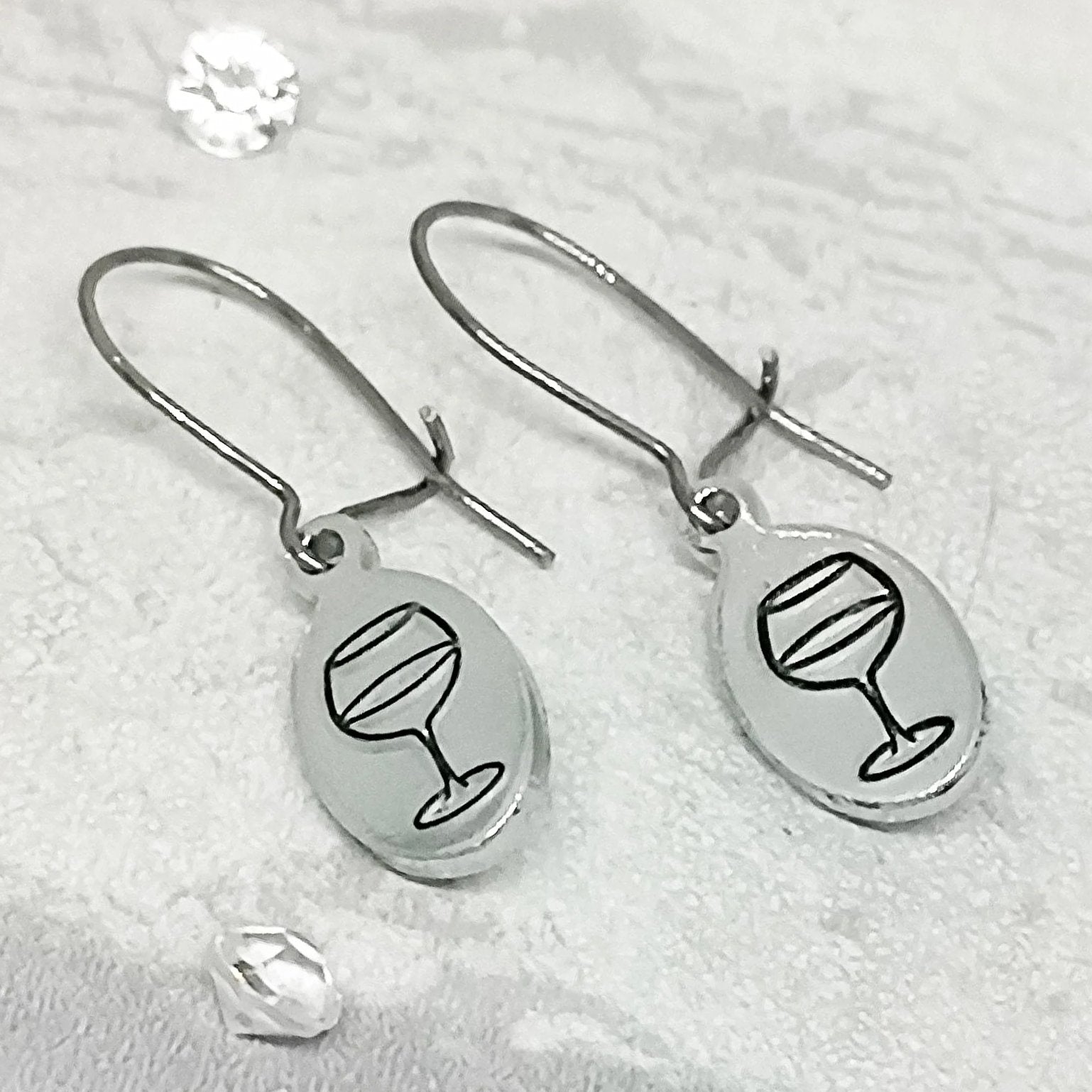 Hypo-allergenic Surgical Steel wires with hand-stamped drop tag with a WINE GLASS design