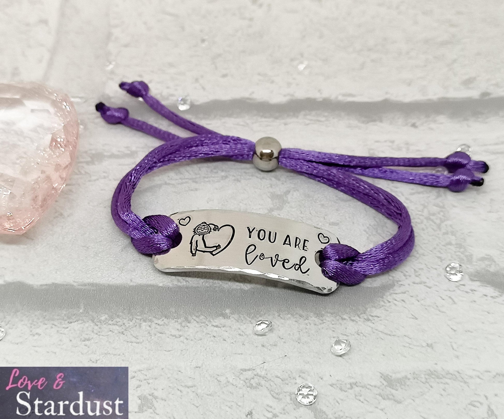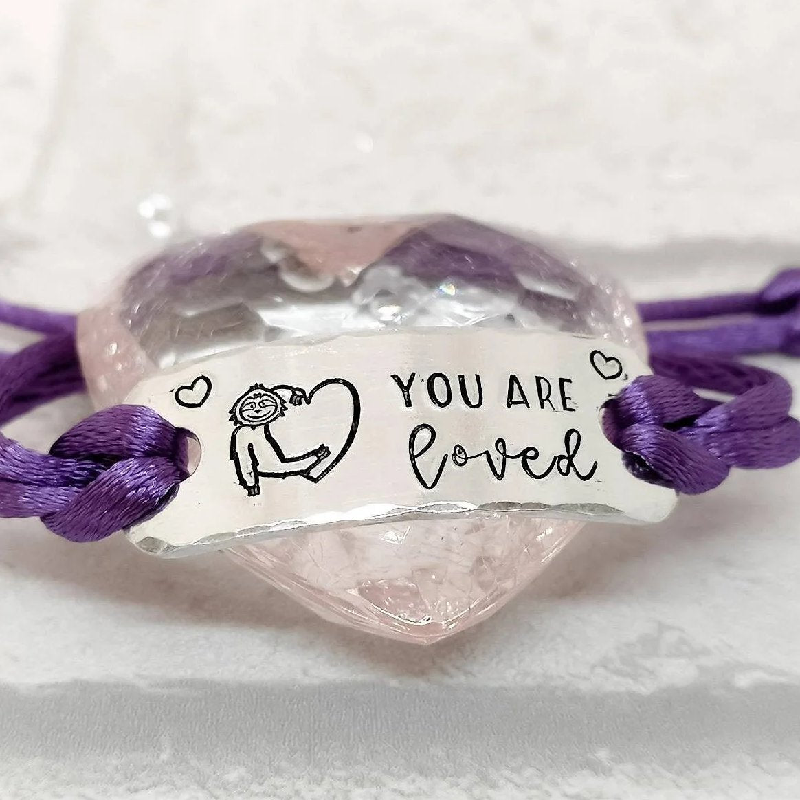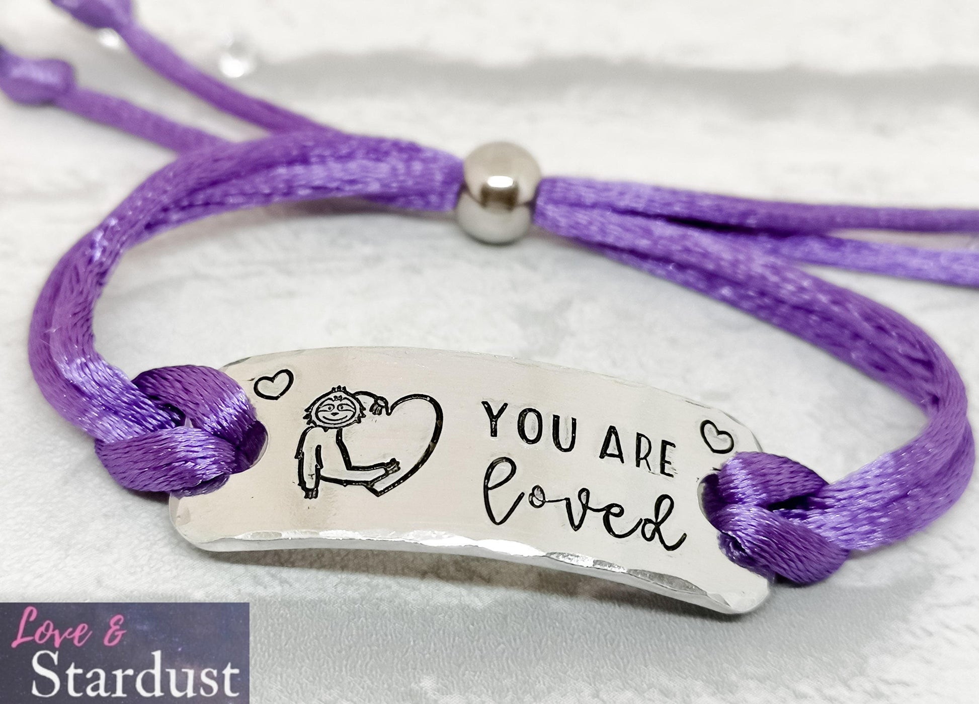Satin corded adjustable slider bracelet with the quote YOU ARE LOVED and a cute sloth hugging a heart design