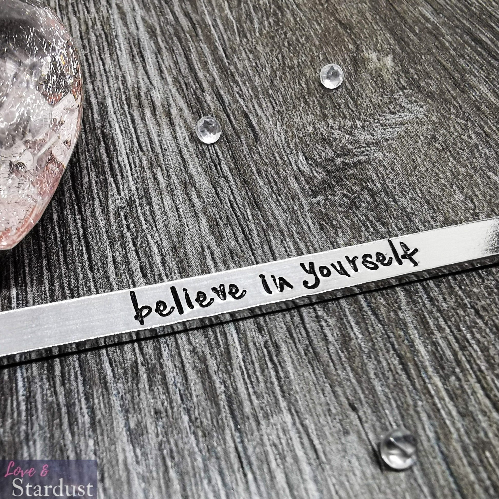 Lightweight Aluminium Skinny Cuff Bangle with the quote "believe in yourself"