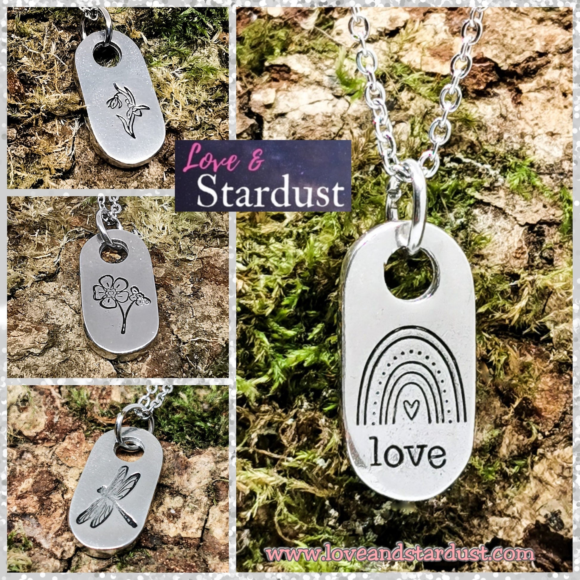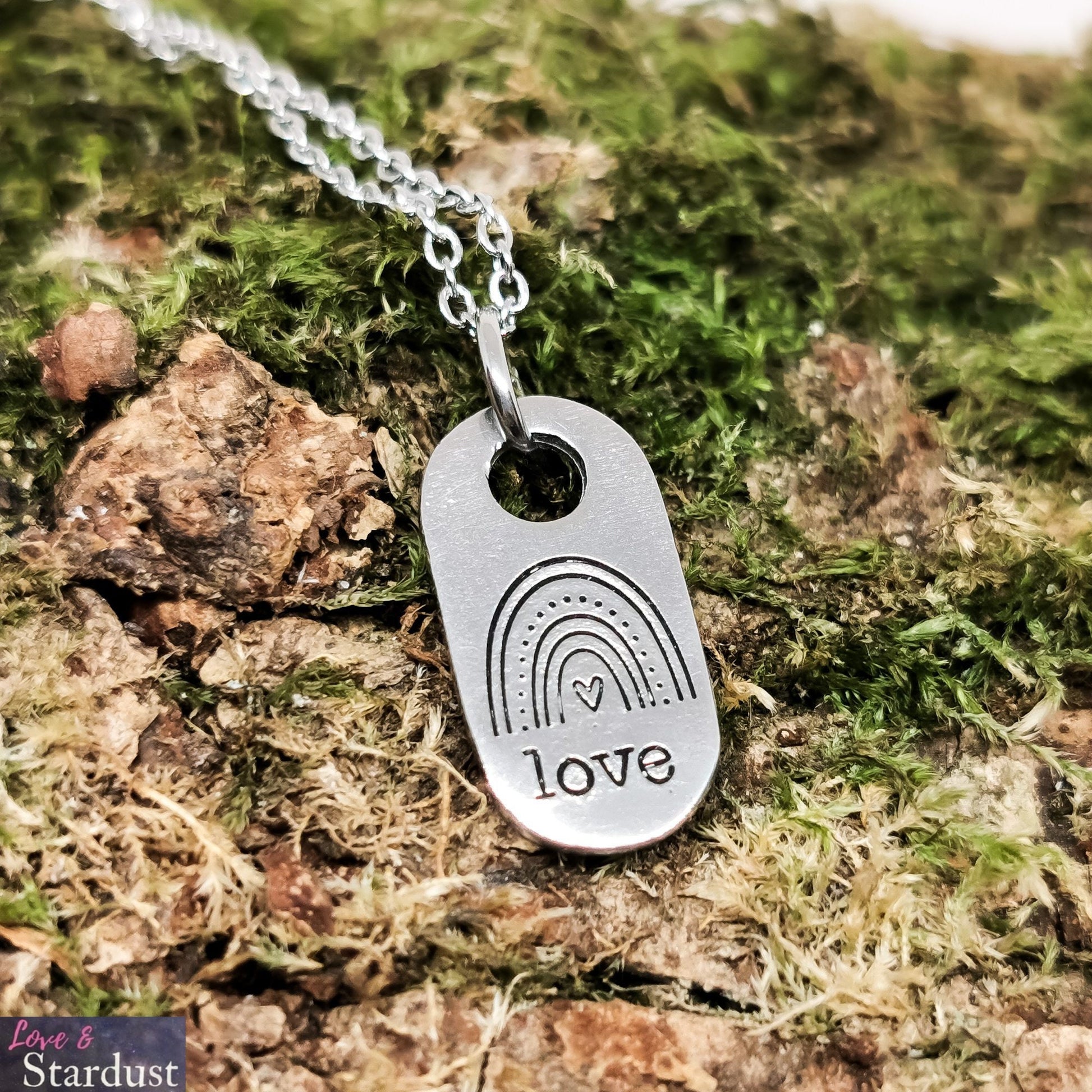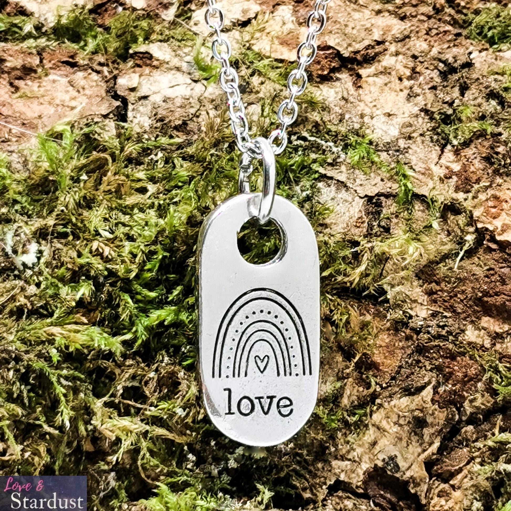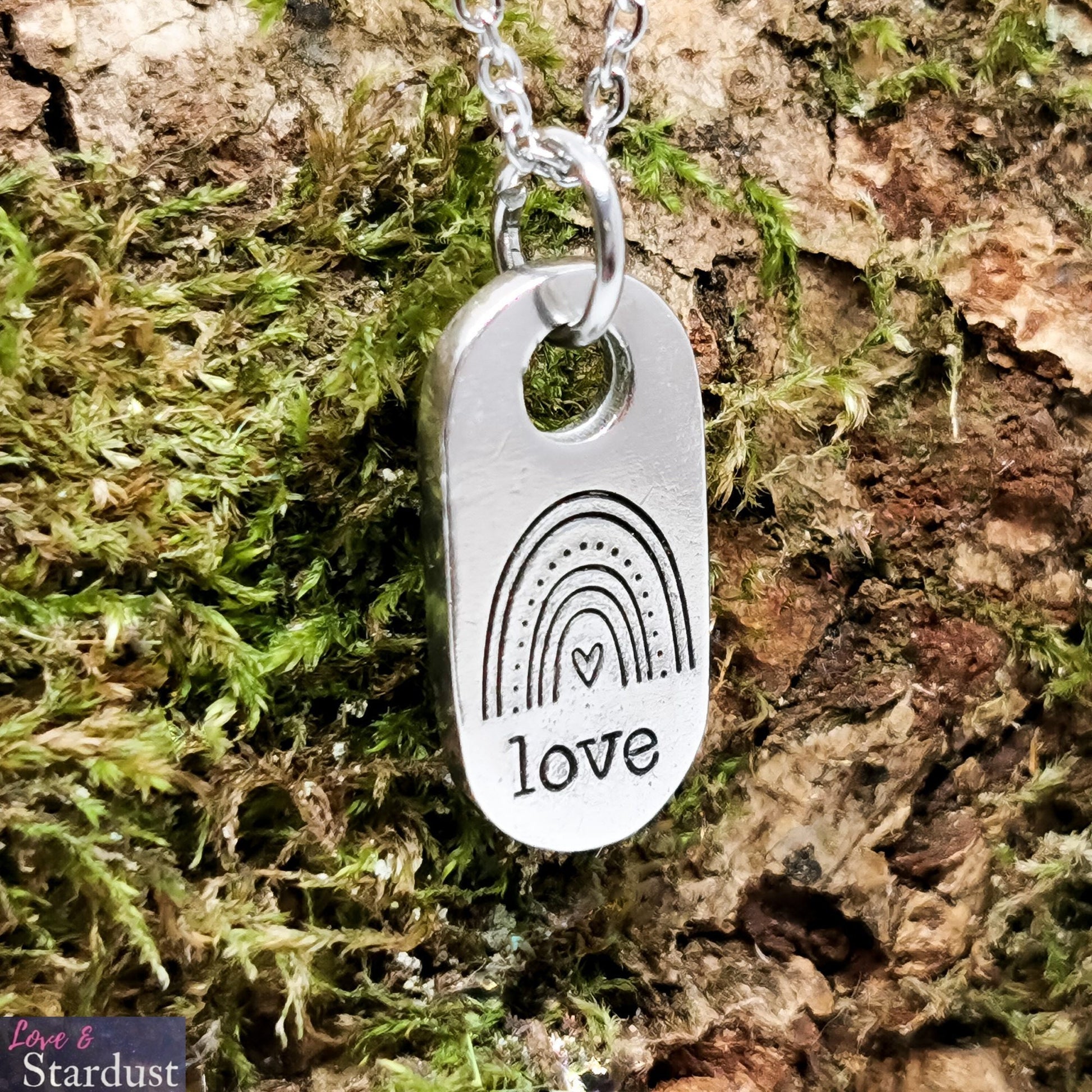 Hand cast Pewter Pendant, hand-stamped with a Rainbow and LOVE