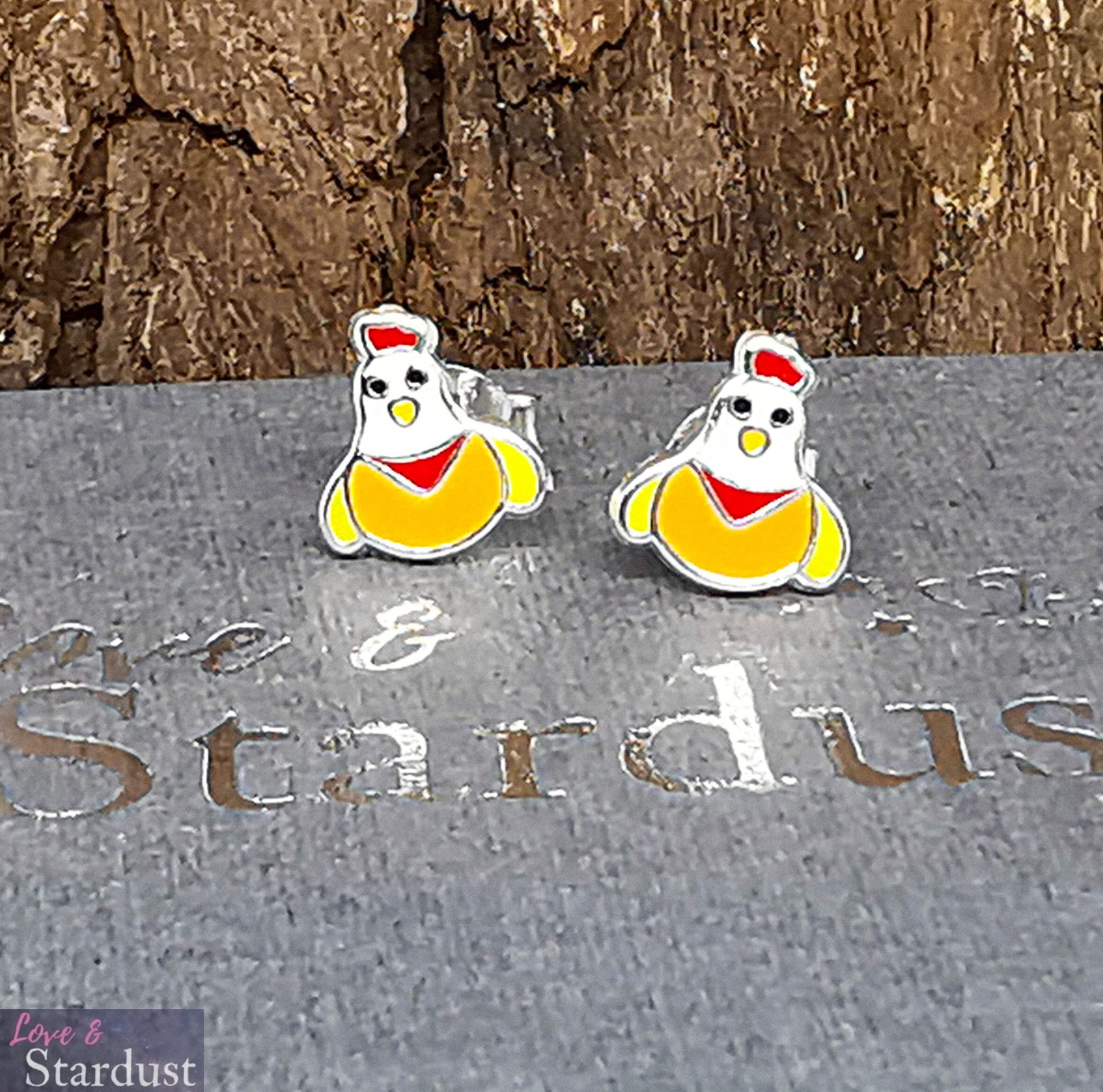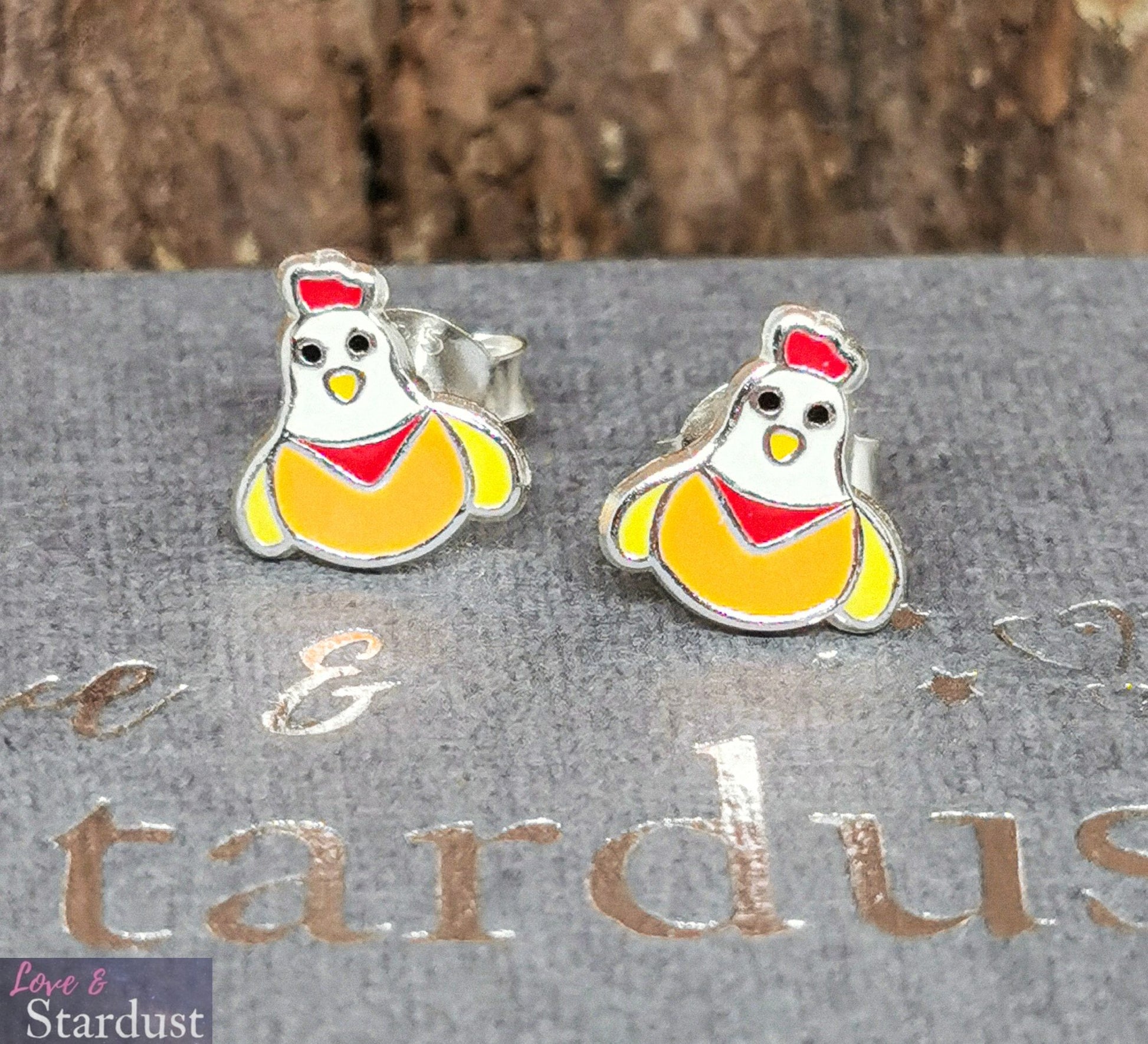 Solid 925 Sterling silver & Enamel Chicken earrings in a beautiful gift box.