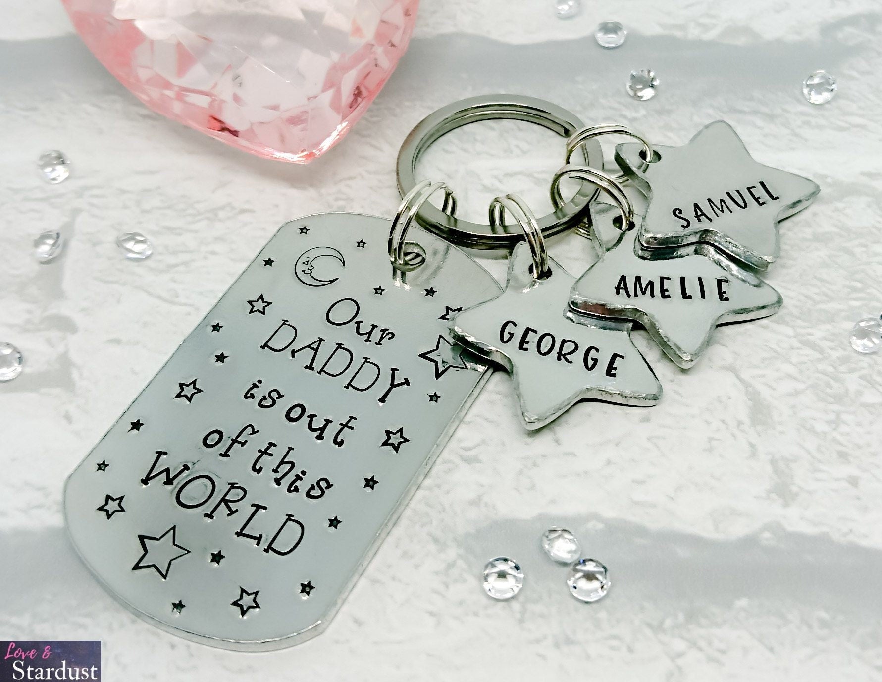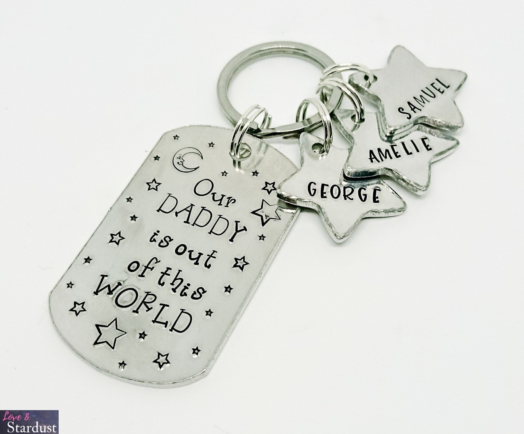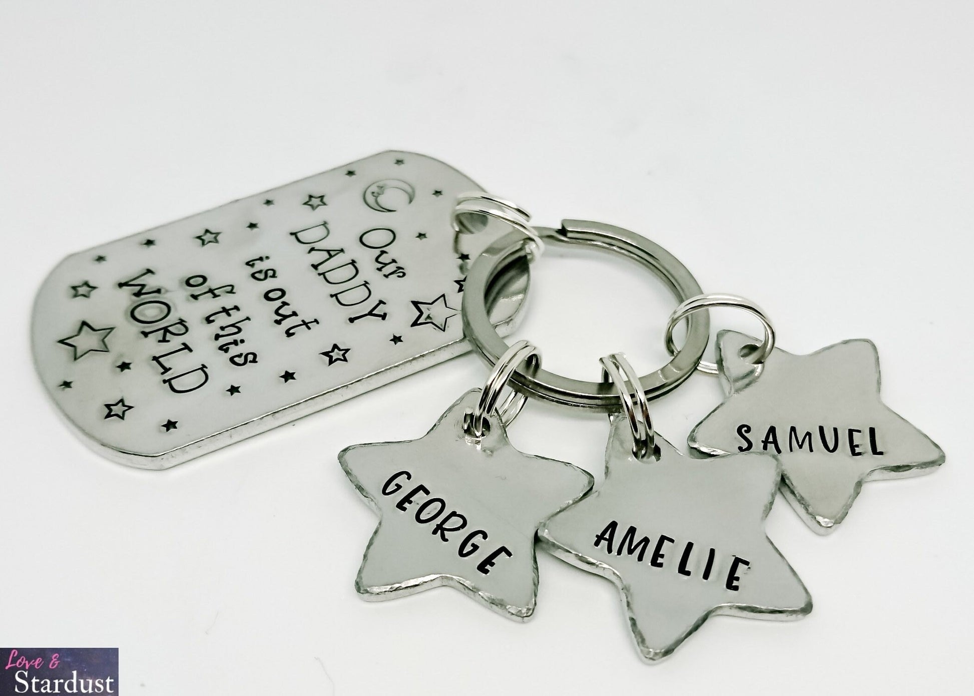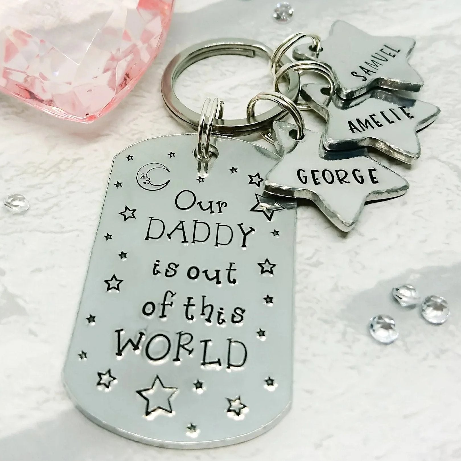 Hand-stamped Keyring with the quote OUR DADDY IS OUT OF THIS WORLD with a Star charm(s) with Child's name on.