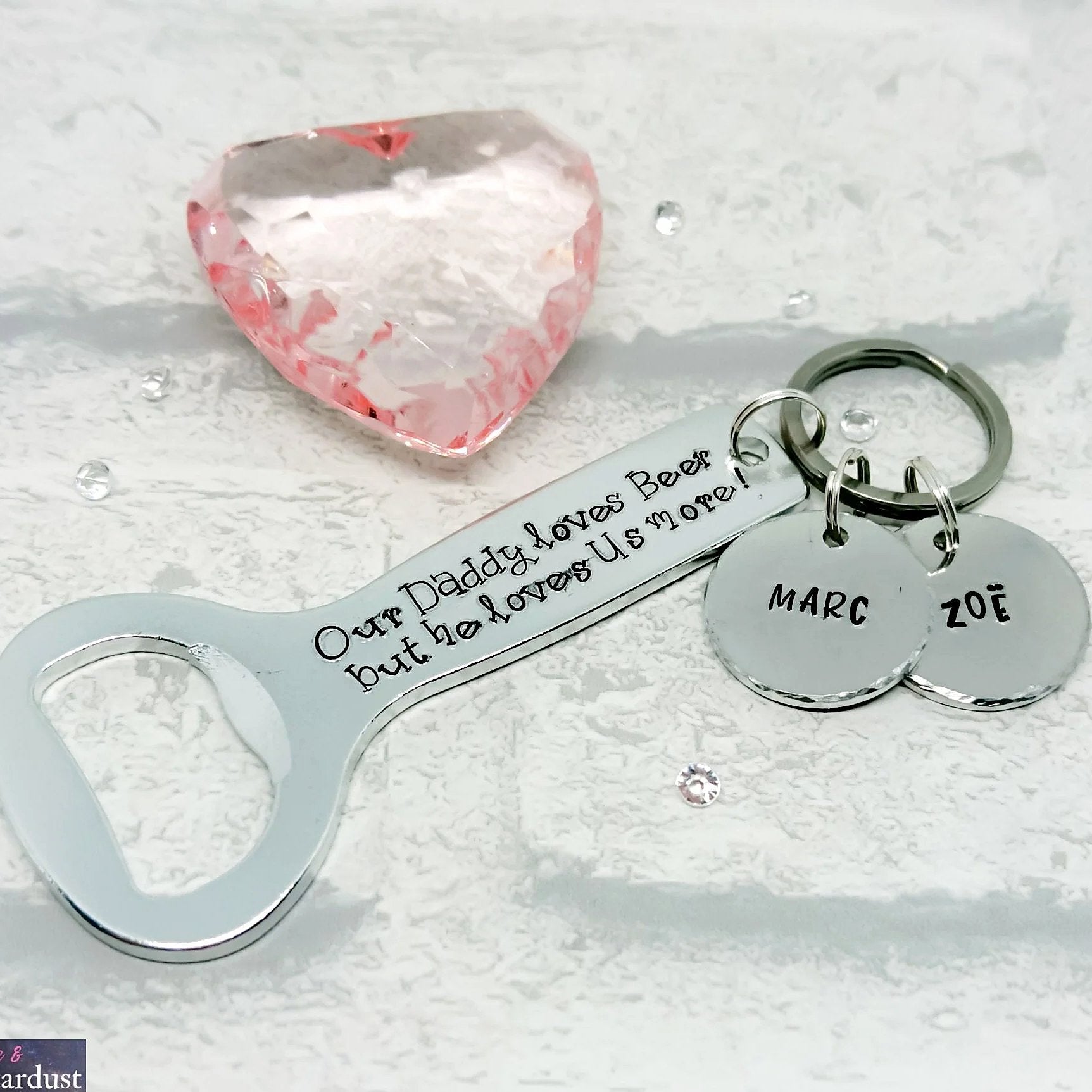 Hand-stamped Bottle Opener with the quote OUR DADDY LOVES BEER BUT HE LOVES US MORE with additional Tag with your Child's name on.