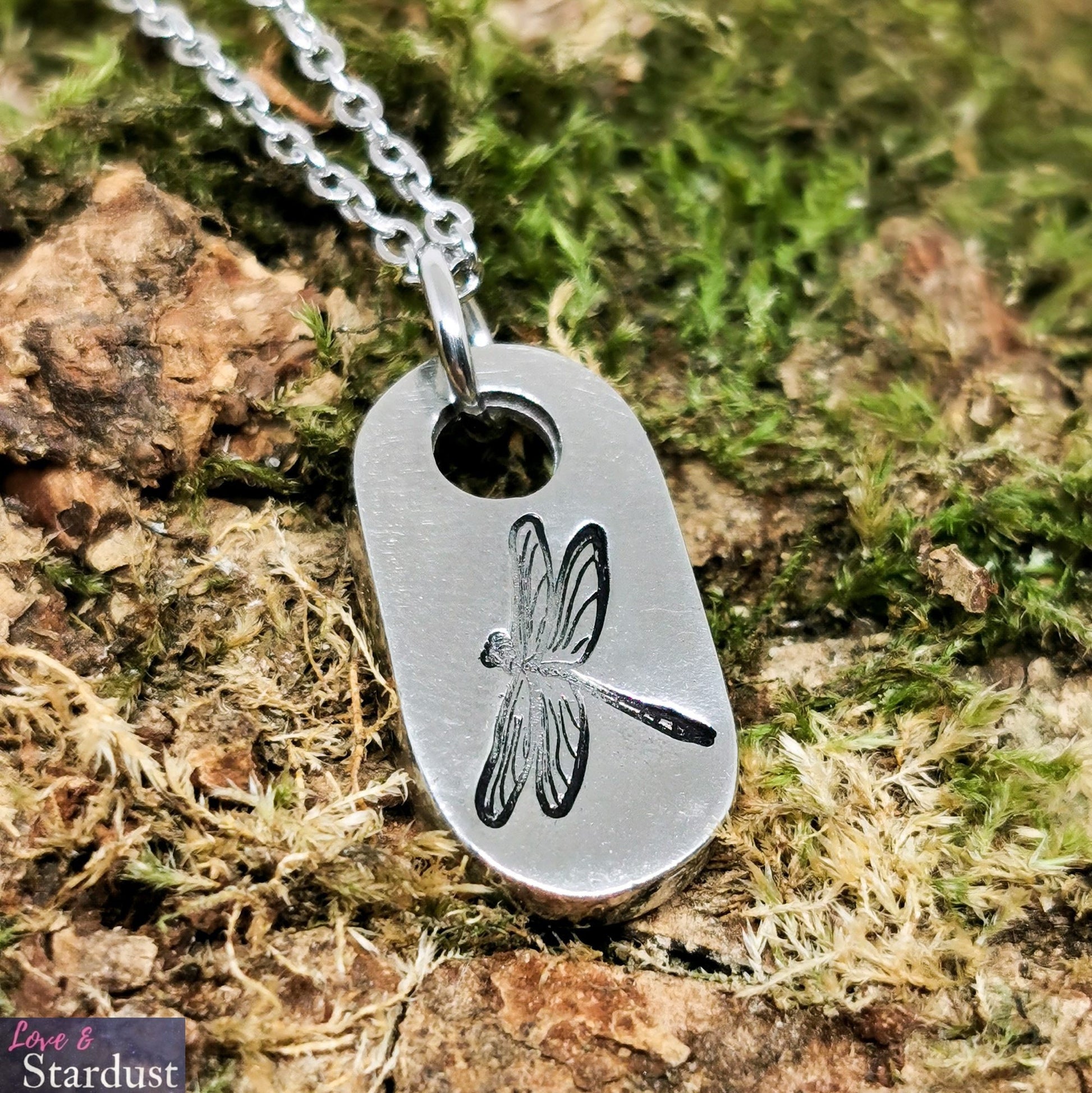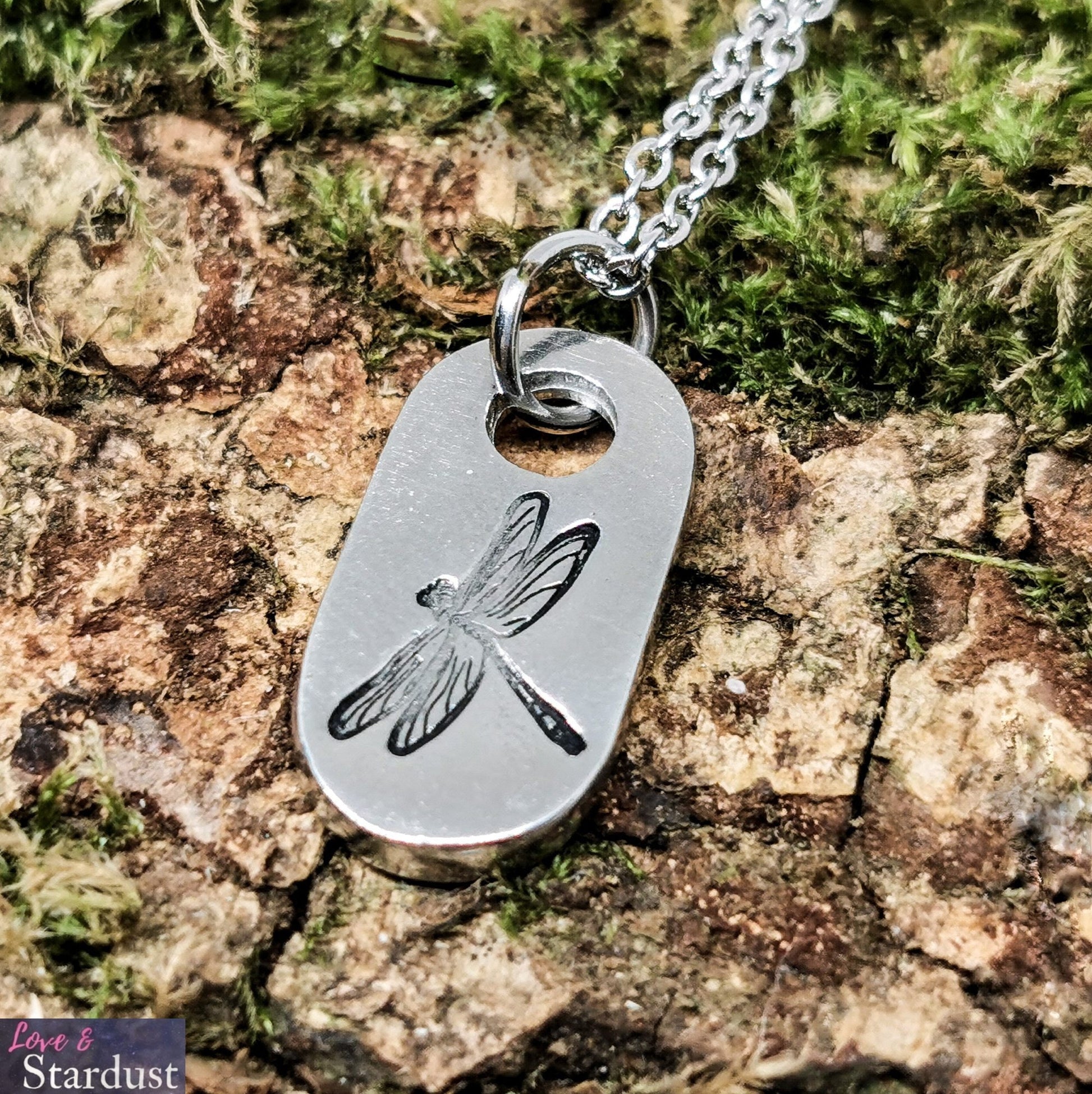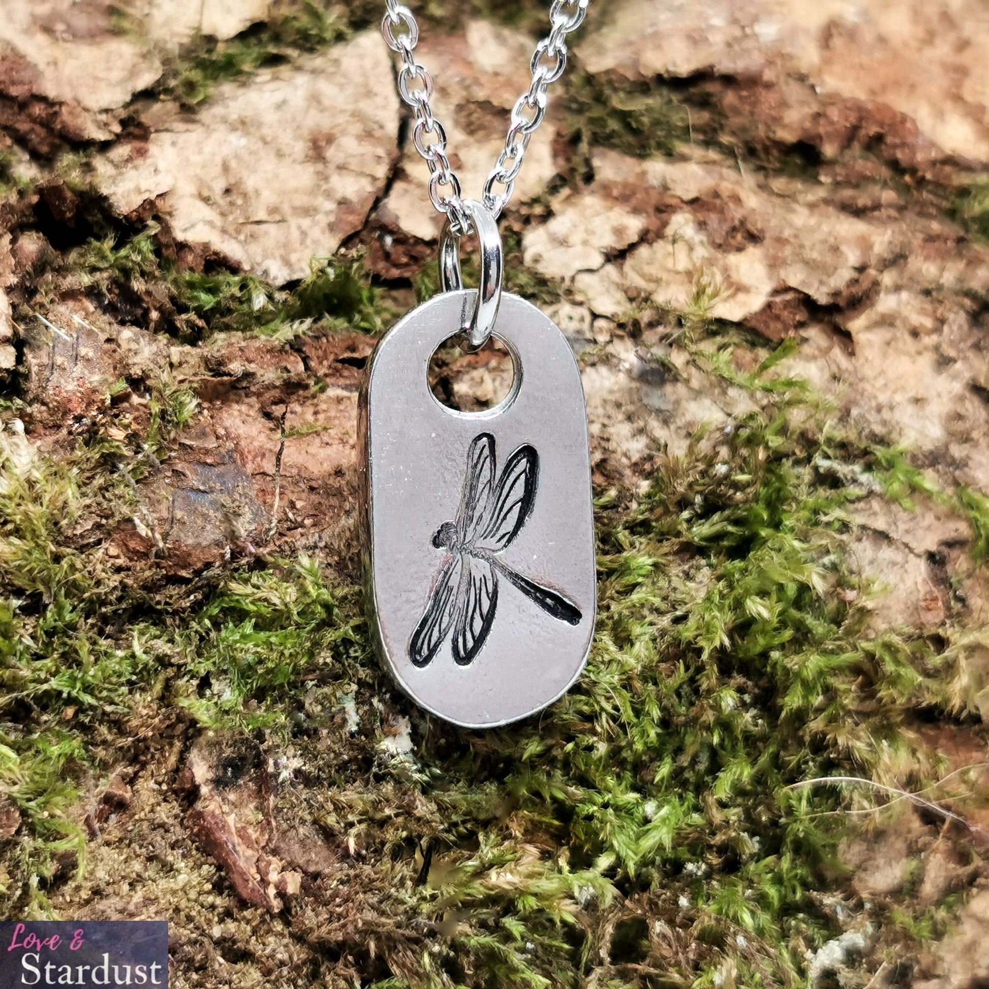 Hand cast Pewter Pendant, hand-stamped with a Dragonfly