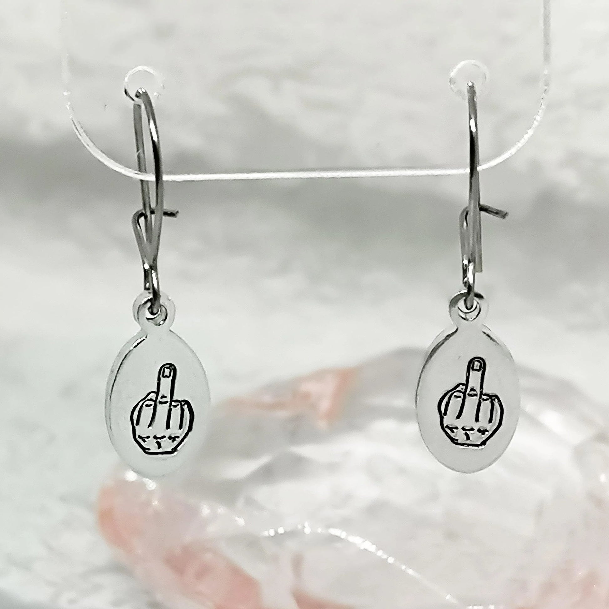 Hypo-allergenic Surgical Steel wires with hand-stamped drop tag with a 'FLIP THE BIRD' design