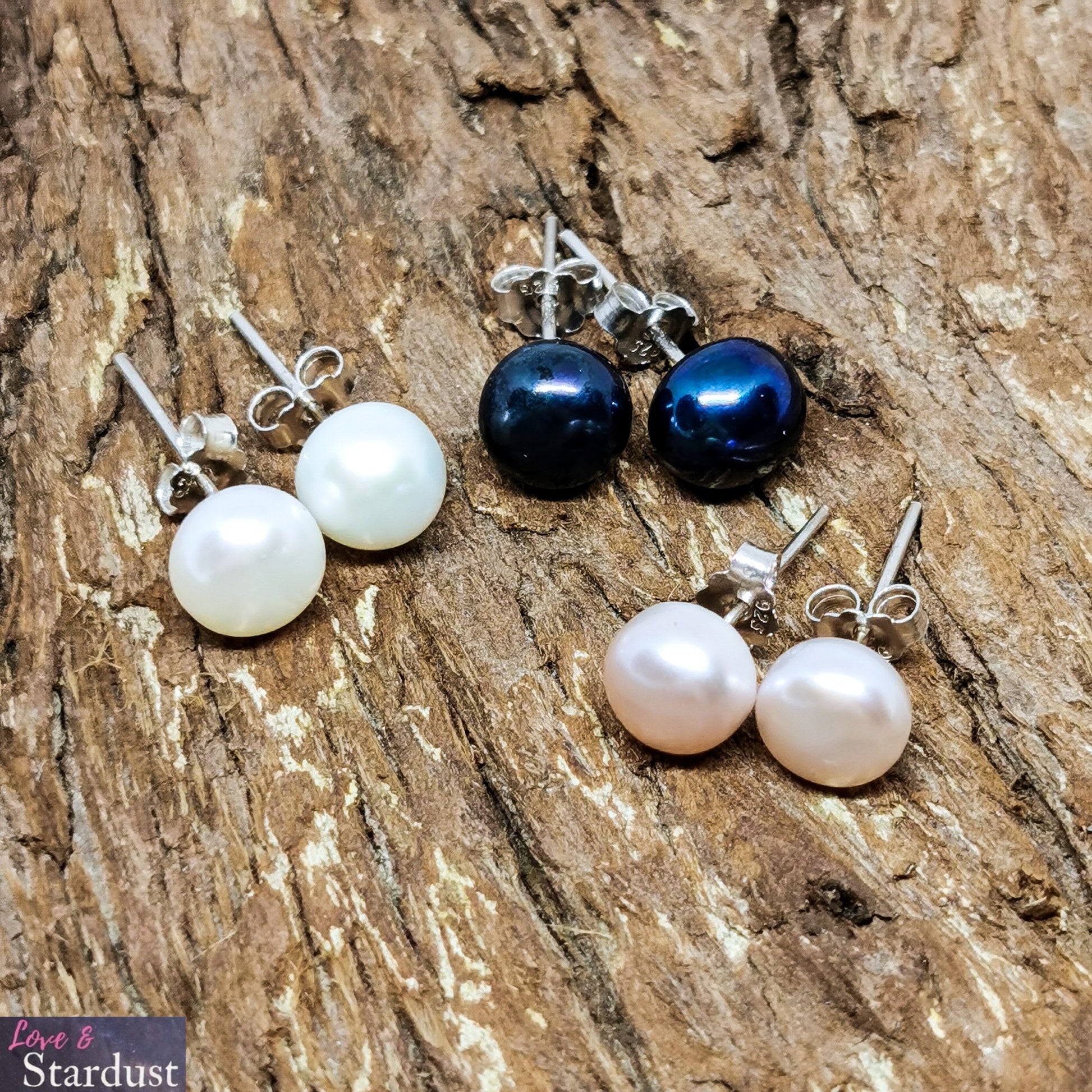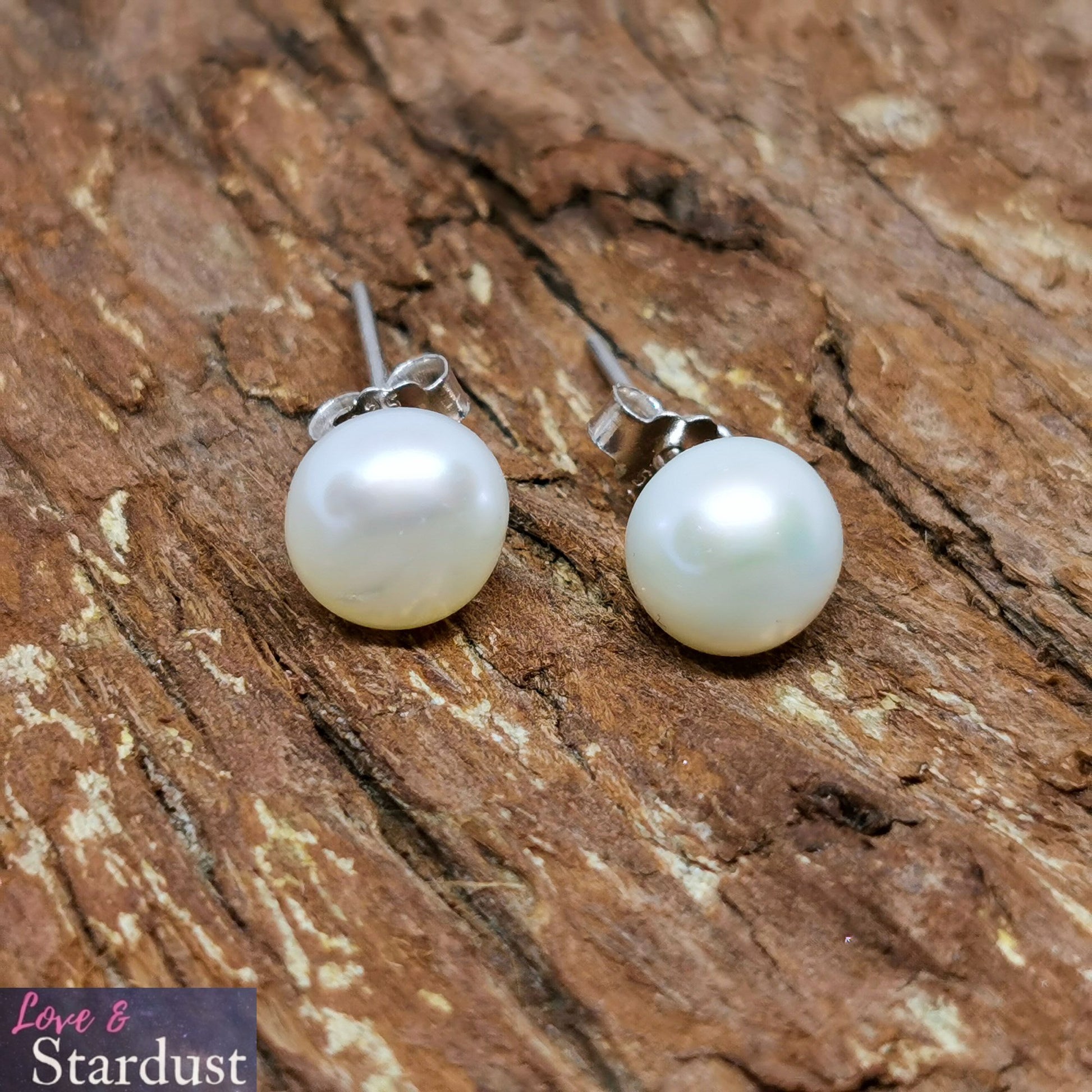 Beautiful button-shaped cultured Freshwater Pearl & Sterling Silver Stud & Post Earrings, in a beautiful gift box.