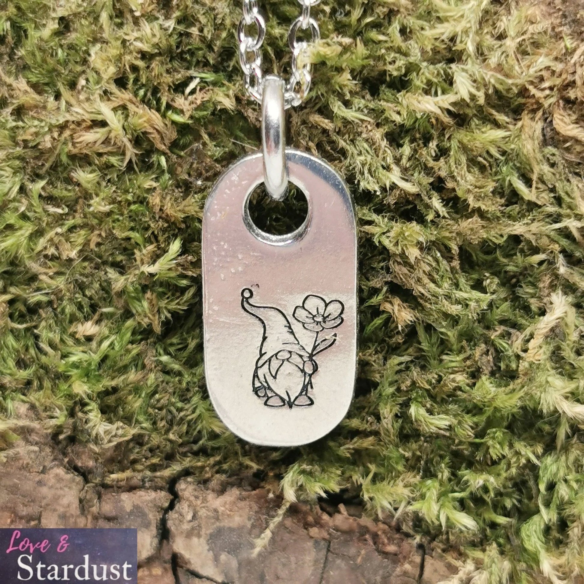 Hand cast Pewter Pendant, hand-stamped with a cute Gonk holding a flower