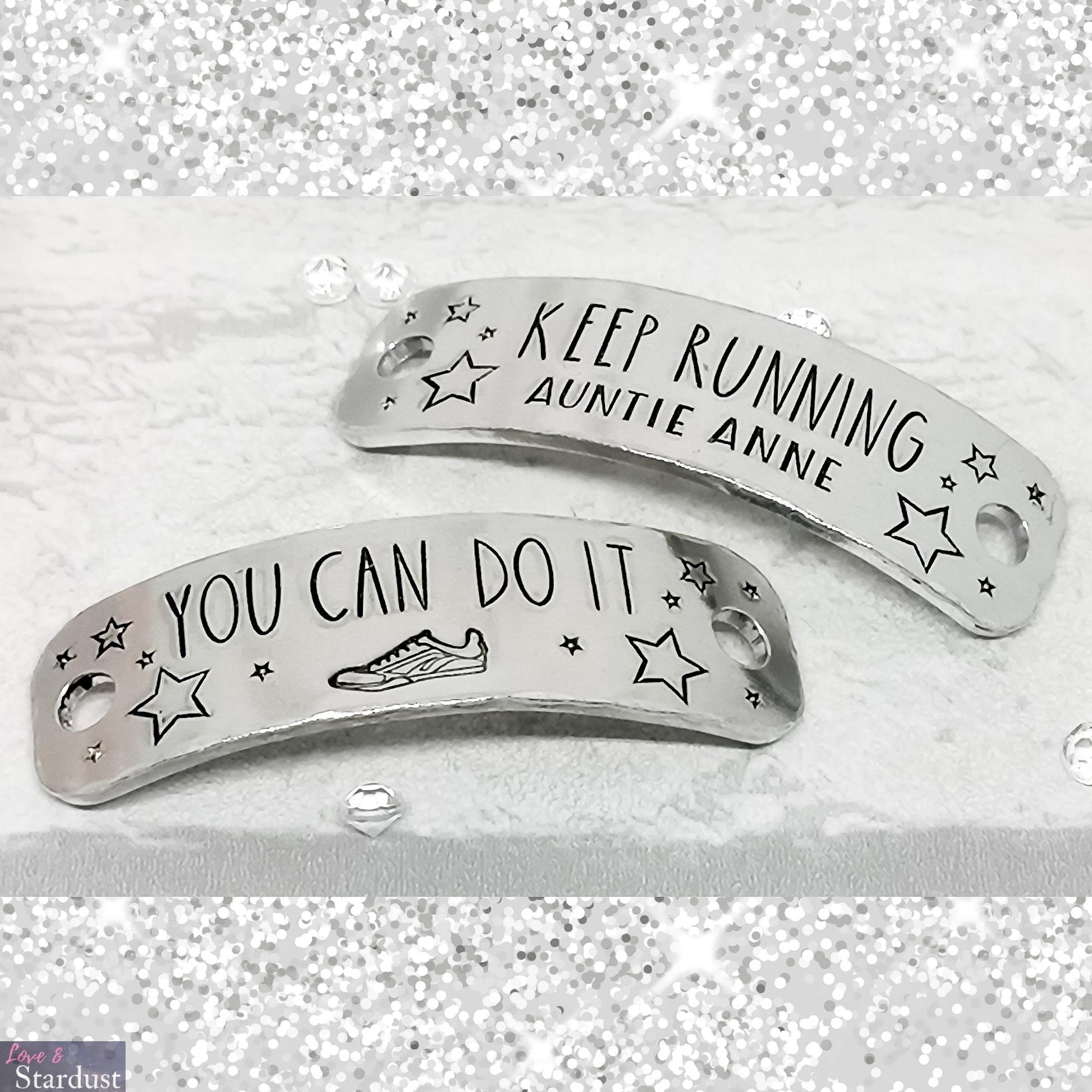 Trainer tags hand-stamped with the quote KEEP RUNNING .... YOU CAB DO IT, personalised with the Name of your choice.