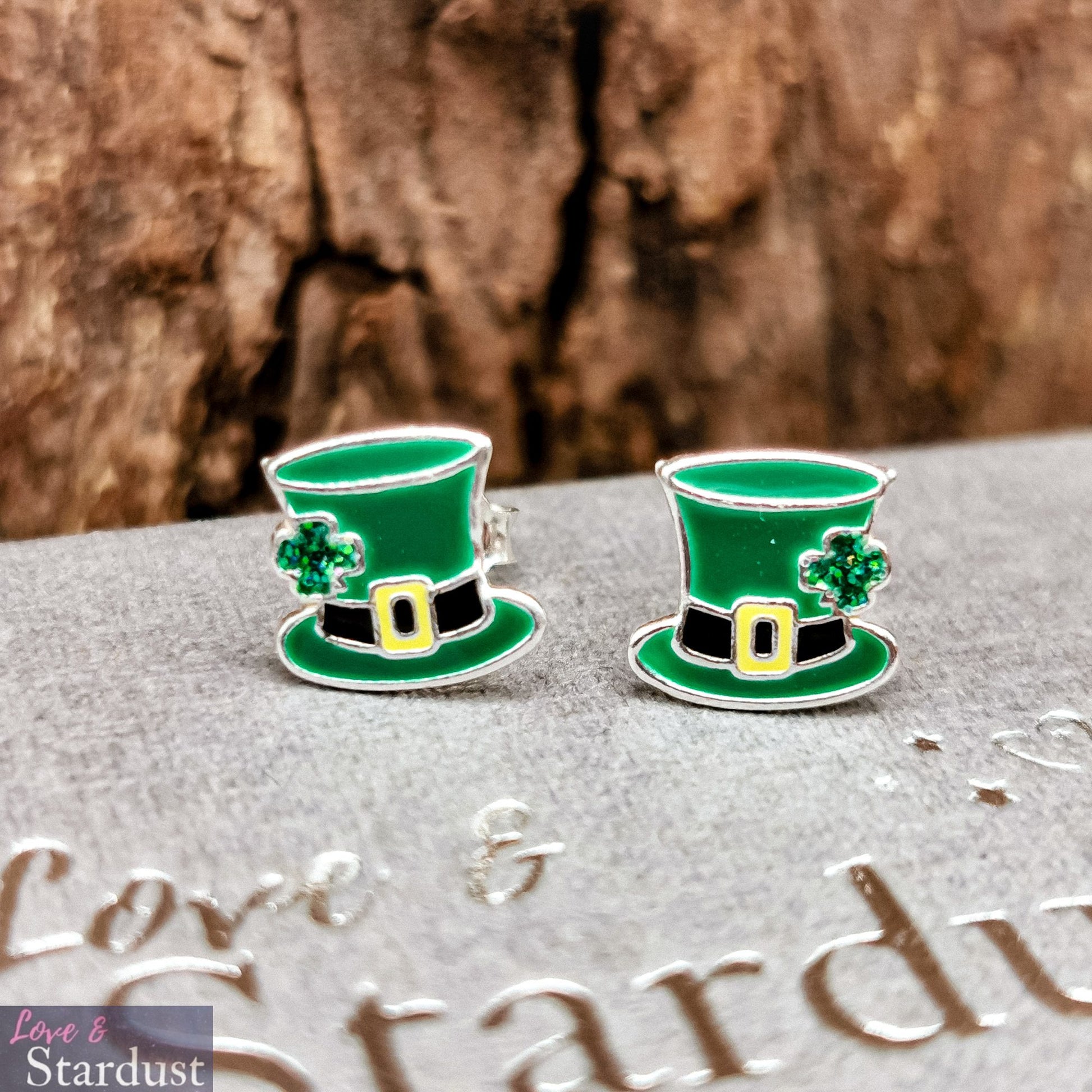 Solid 925 Sterling Silver & Glitter Enamel Leprechaun Hat earrings in a beautiful gift box, perfect for St Patrick's Day