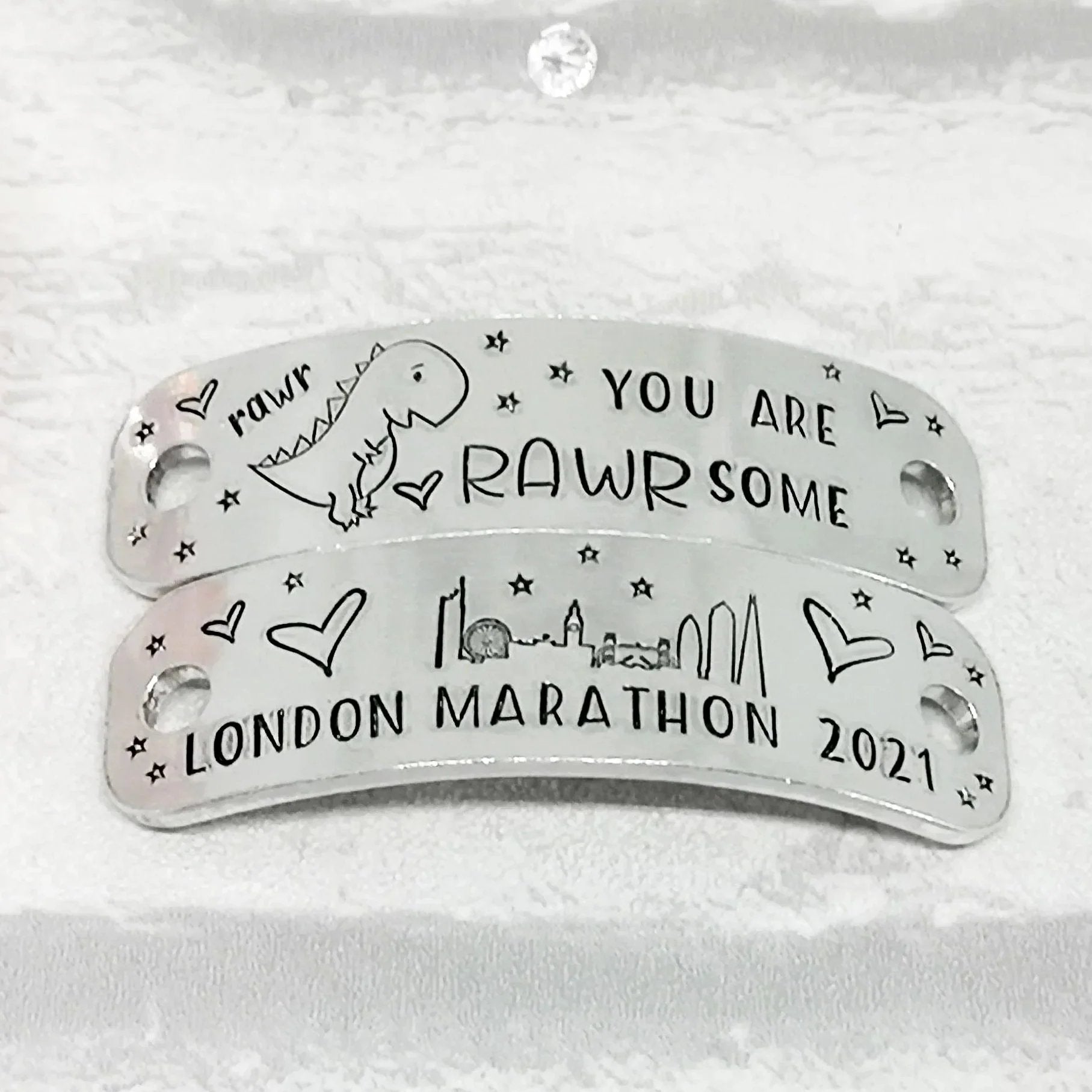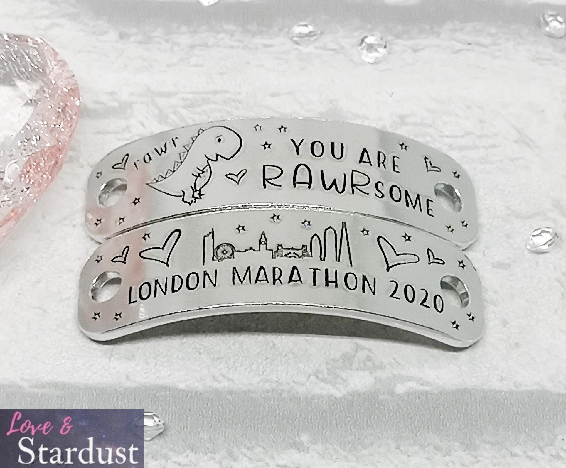 Trainer Tags hand-stamped with the quote You are RAWRsome.... [London Race & distance] with the city skyline