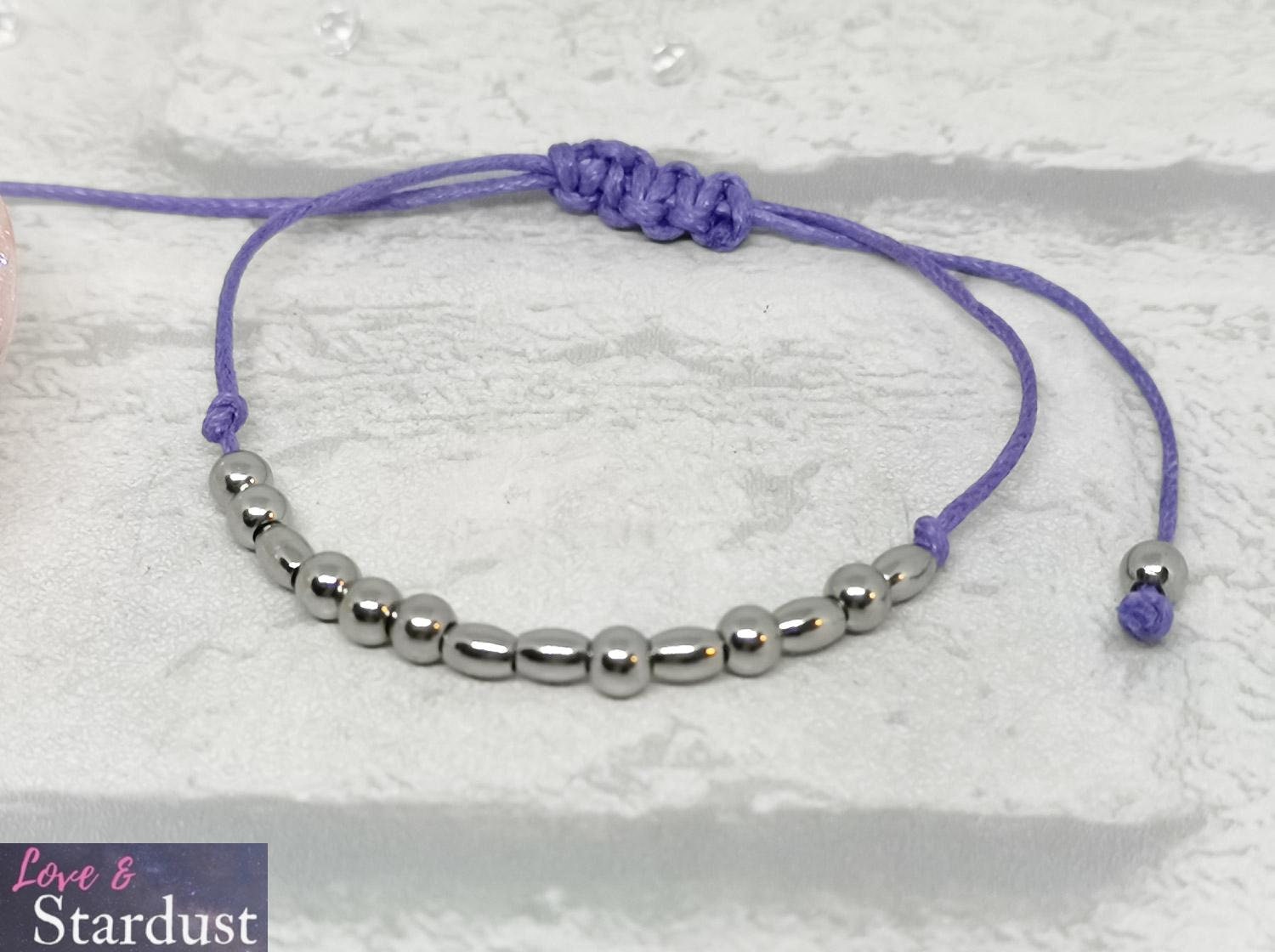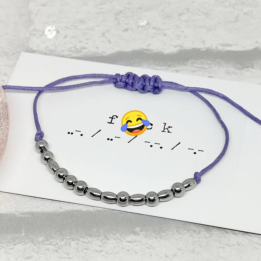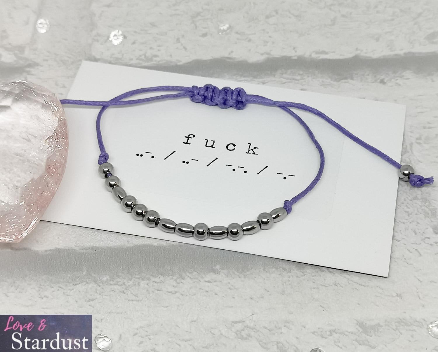 Cotton Corded slider bracelet with stainless steels beads spelling out the word FUCK in morse code