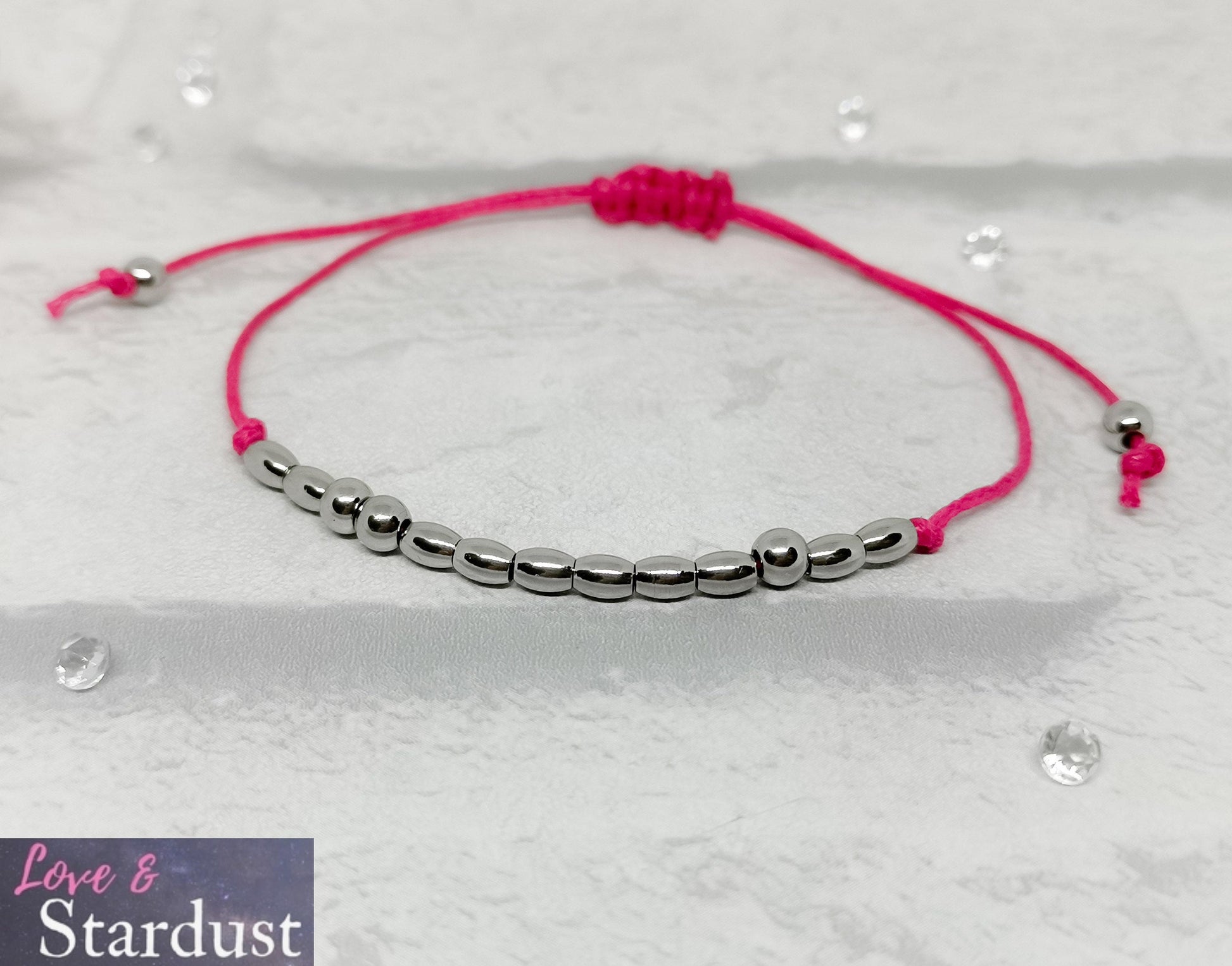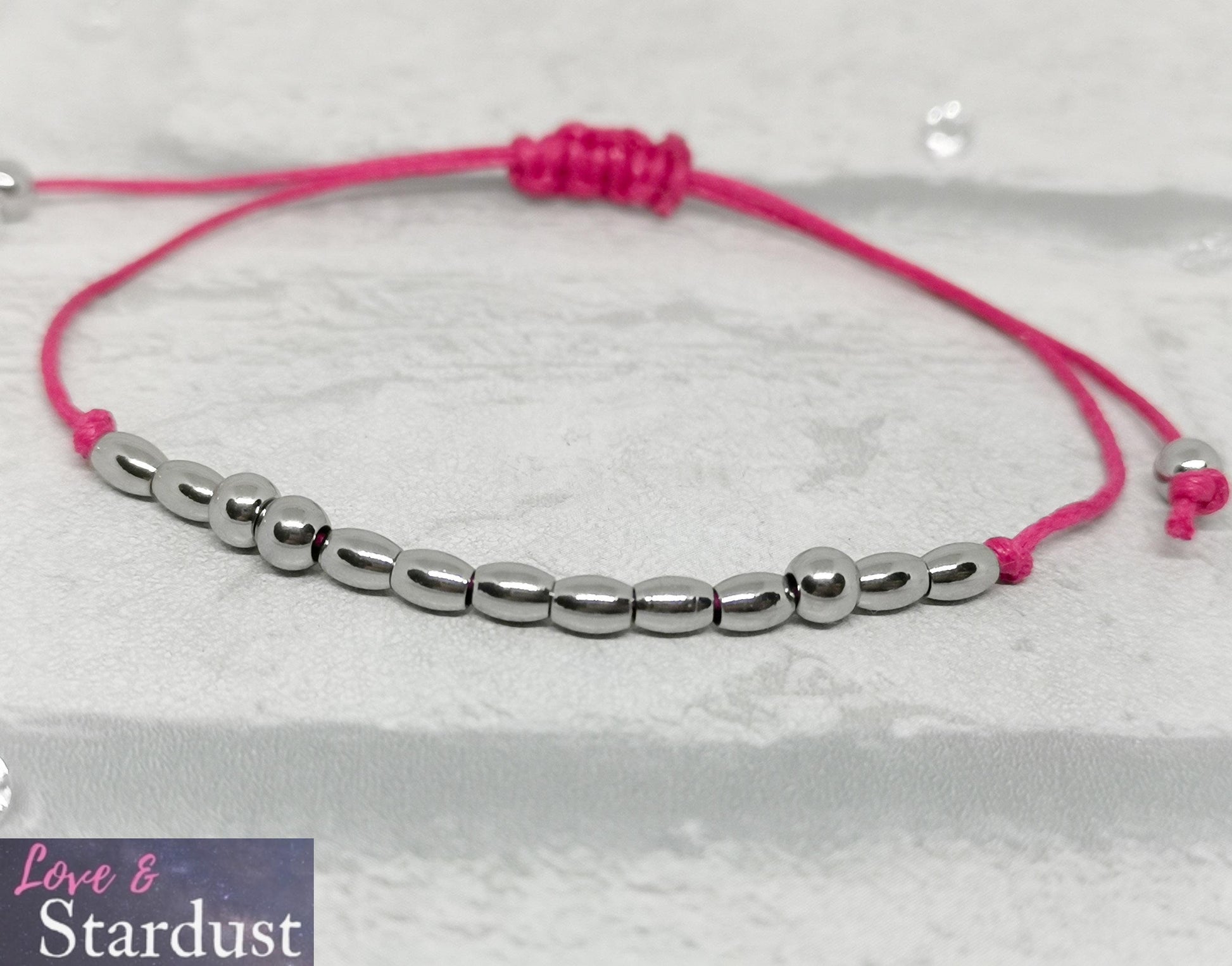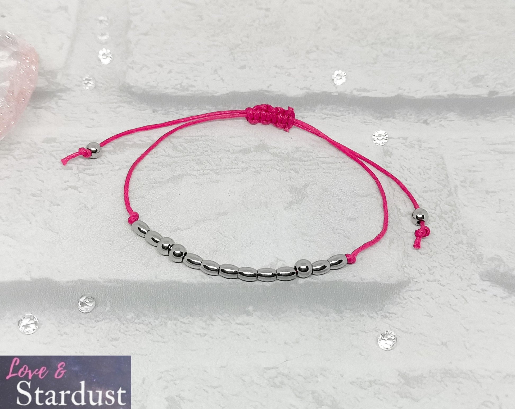 Cotton Corded slider bracelet with stainless steels beads spelling out the word MUMMY in morse code