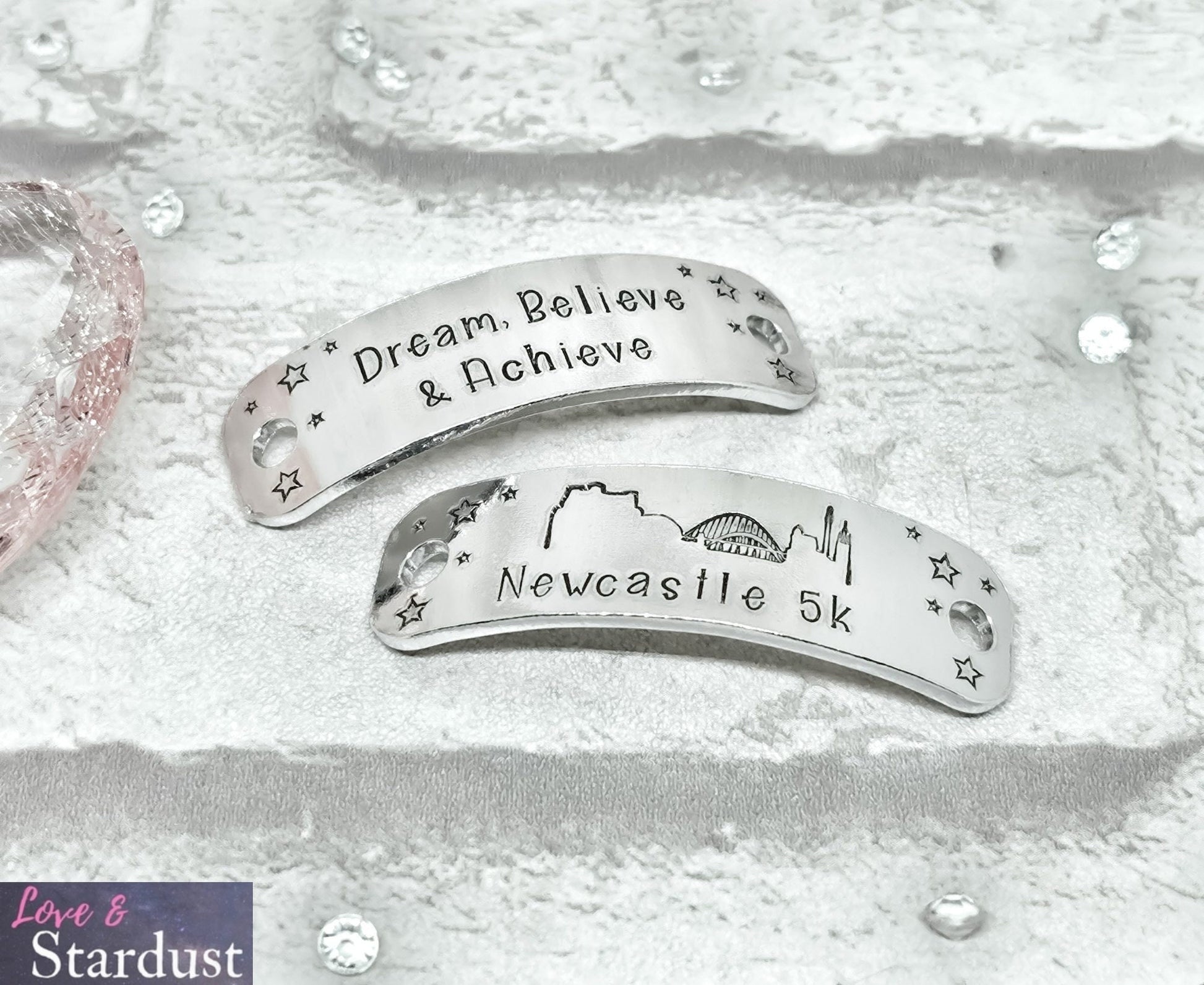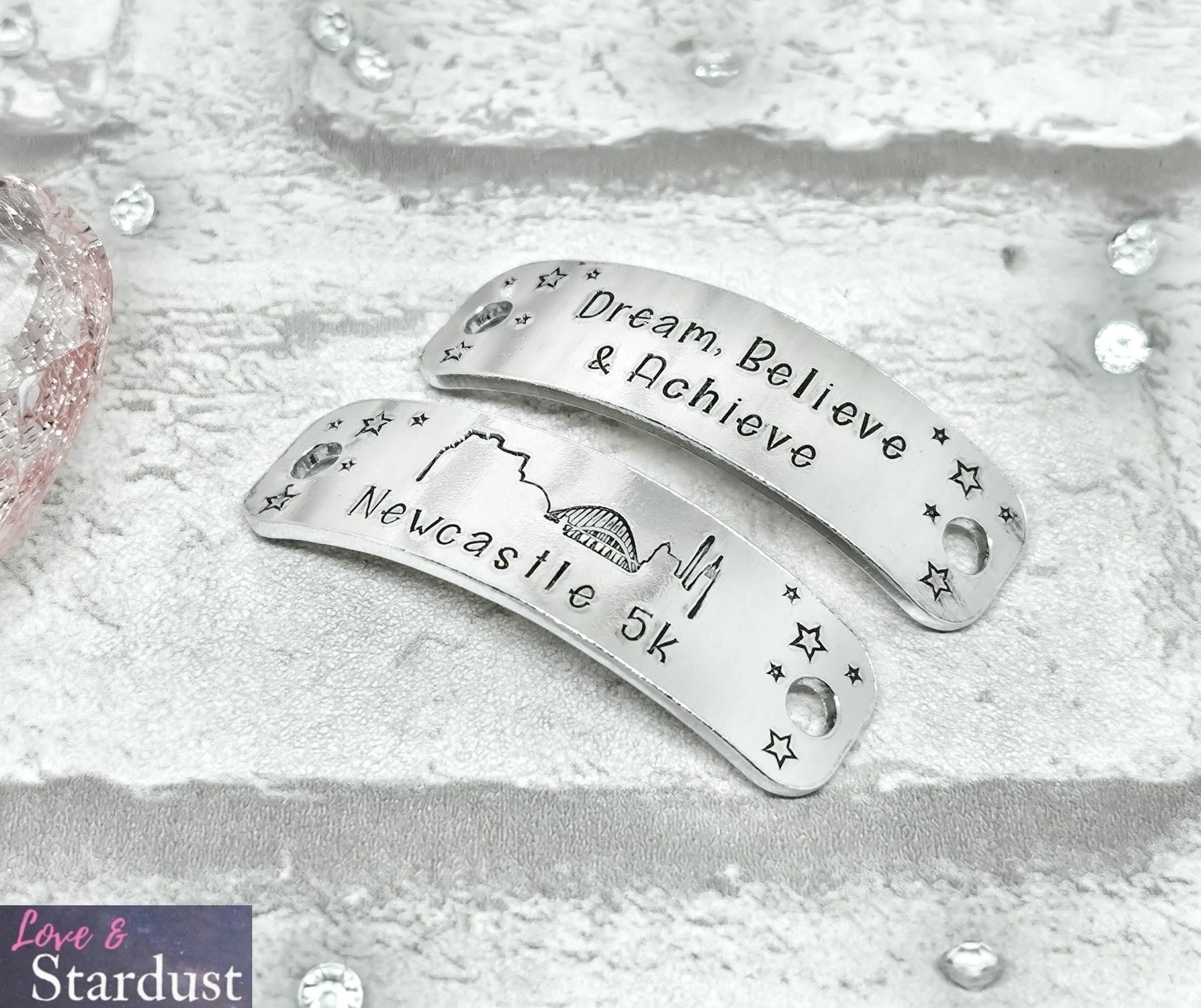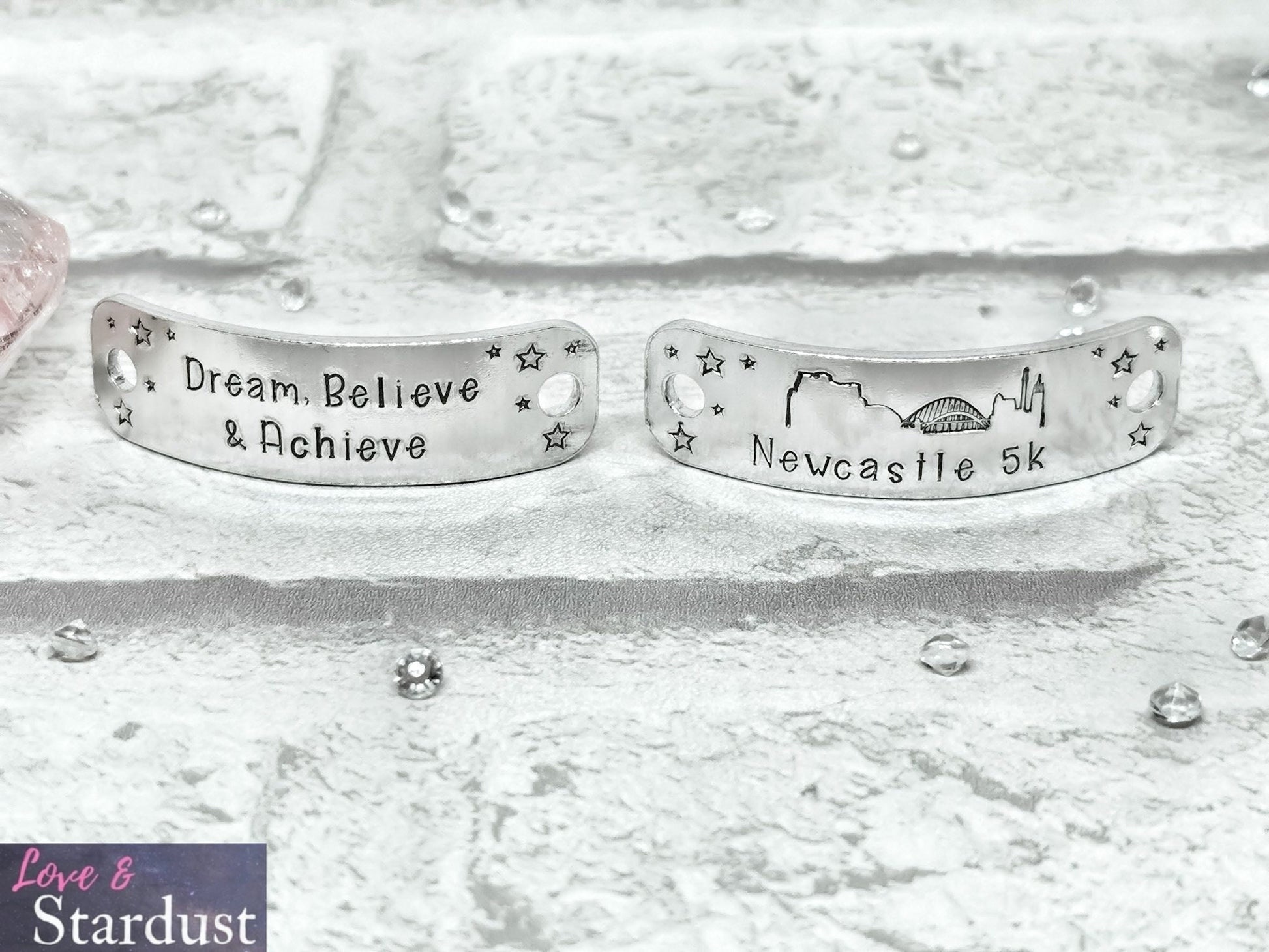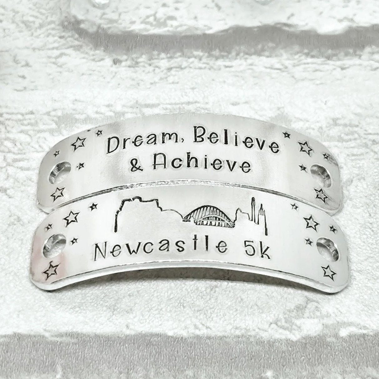 Trainer Tags hand-stamped with the quote Dream, Believe & Achieve.... Newcastle [distance] with the city skyline