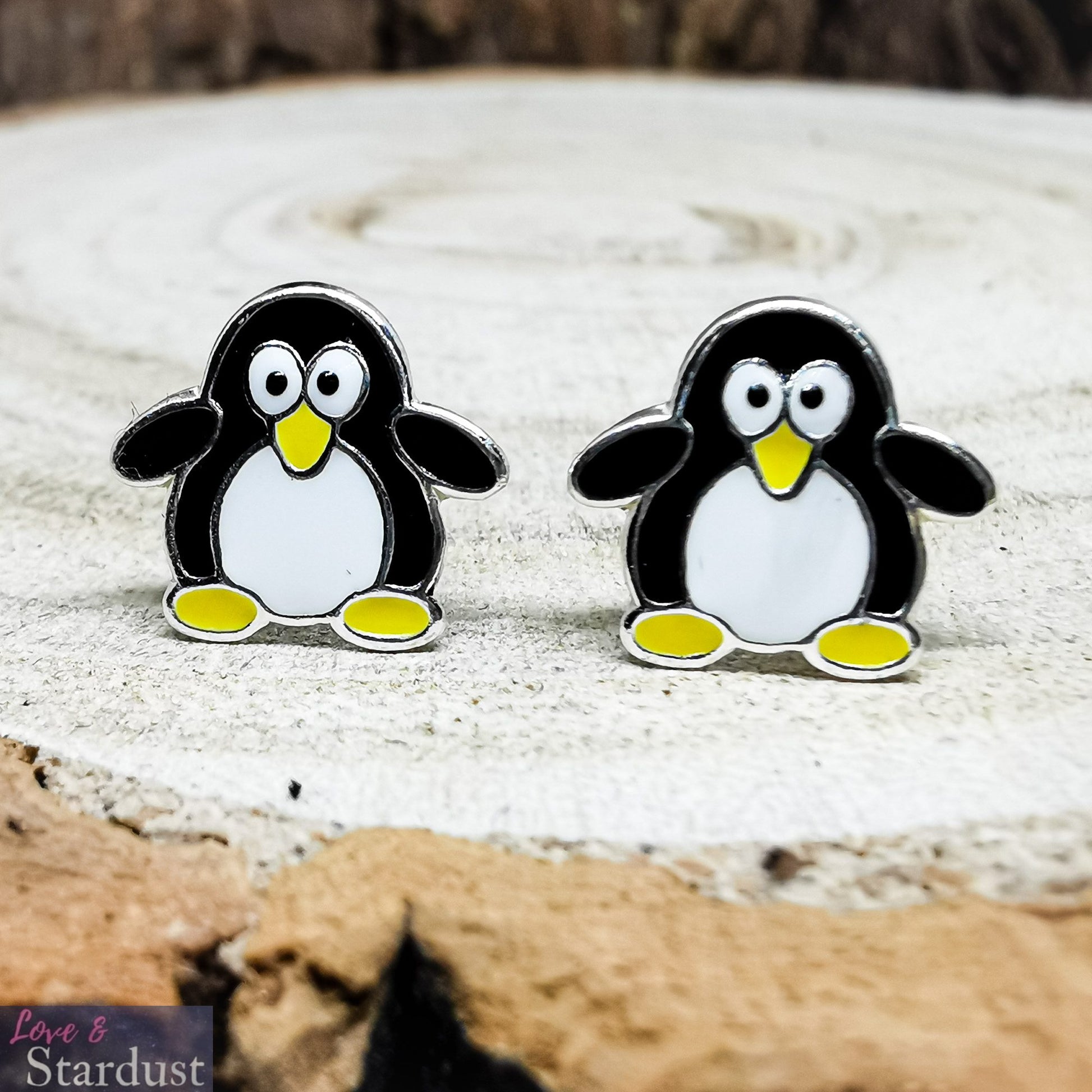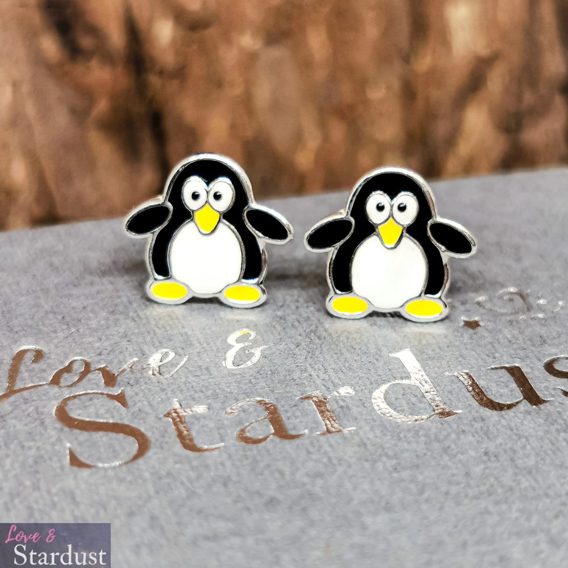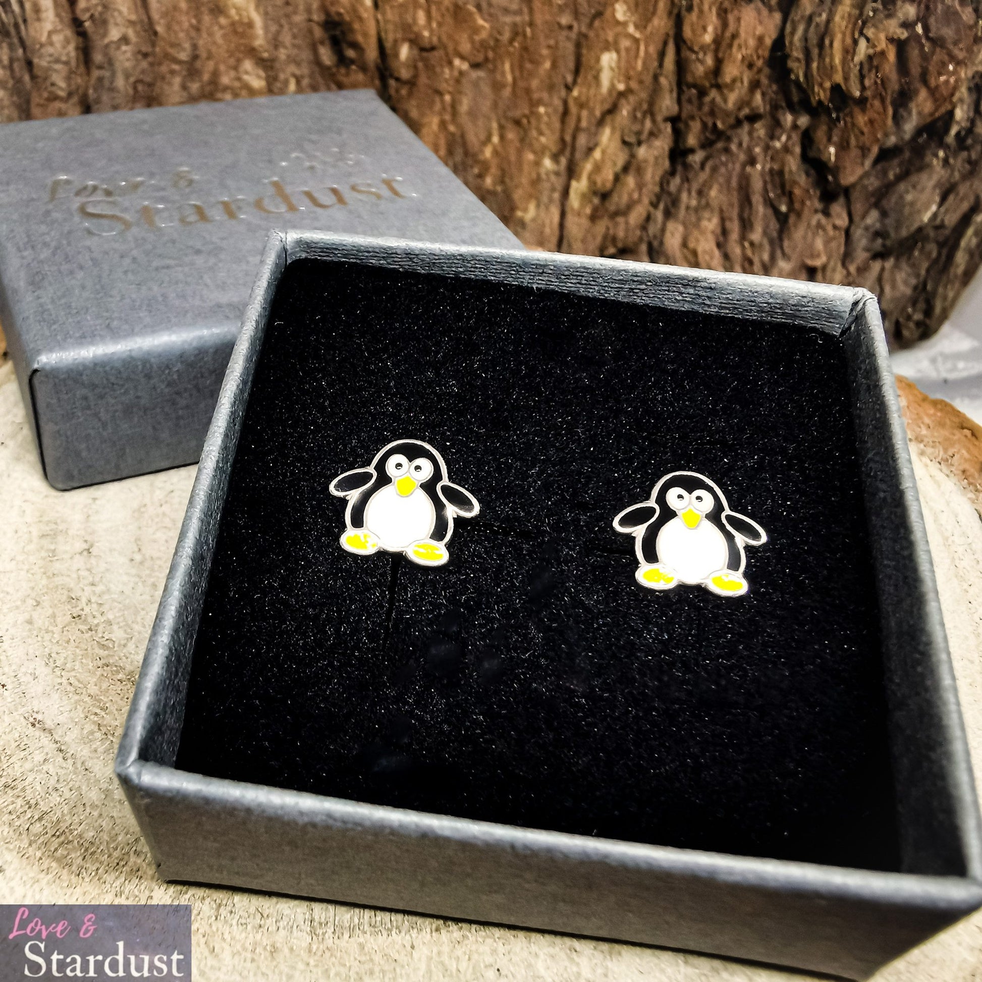 Solid 925 Sterling silver & enamel chubby Penguin earrings in a beautiful gift box.