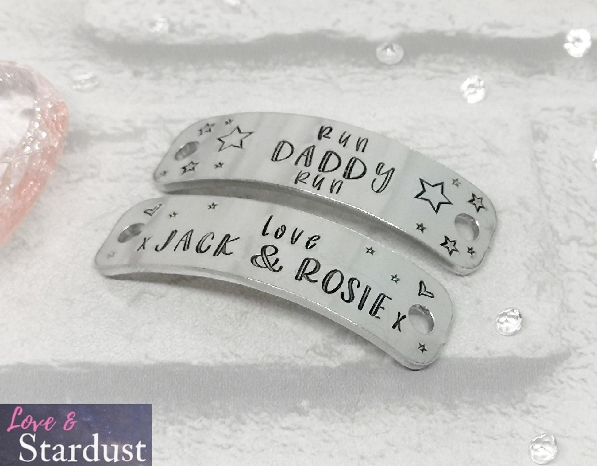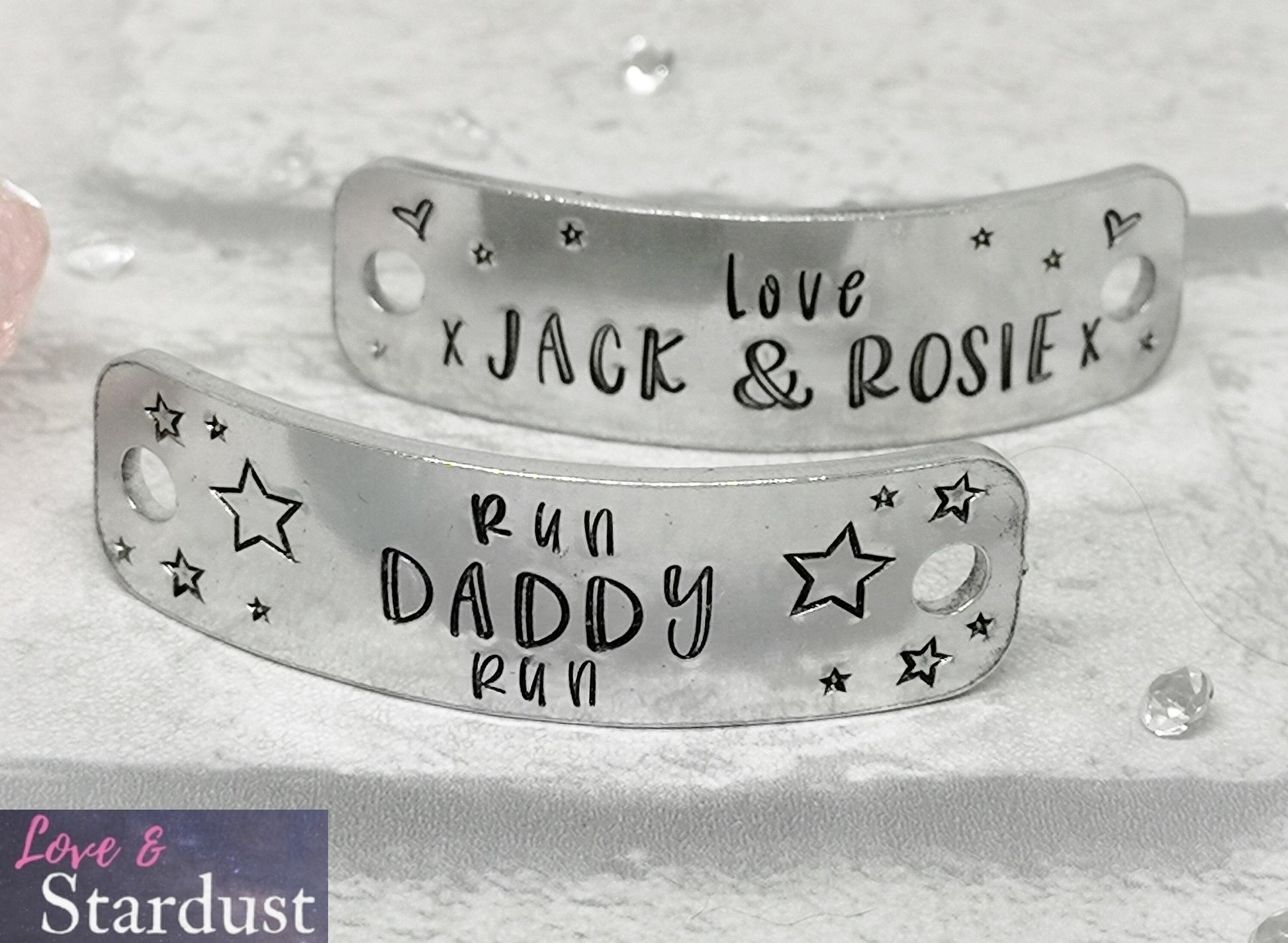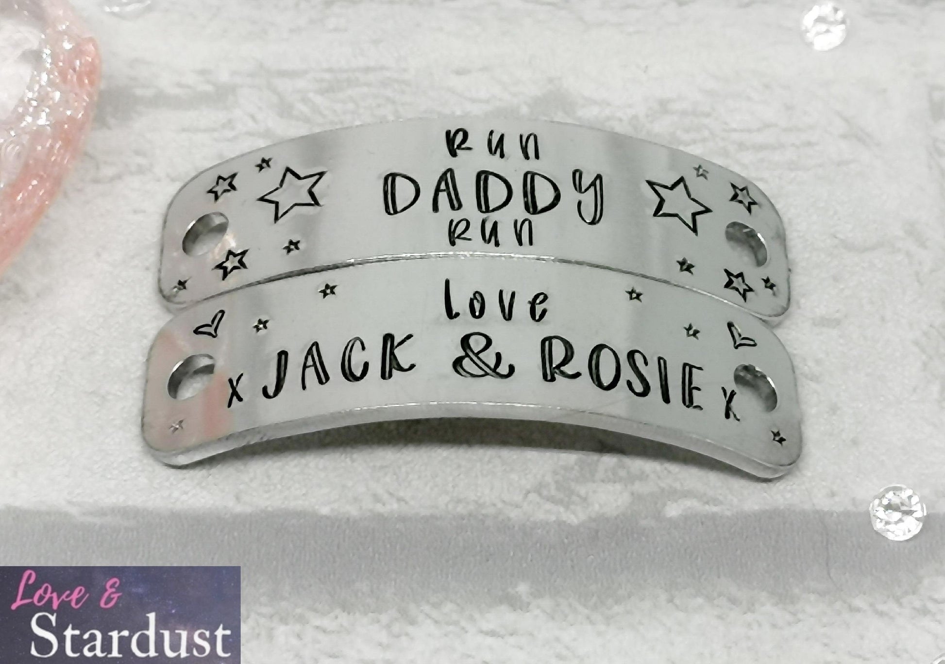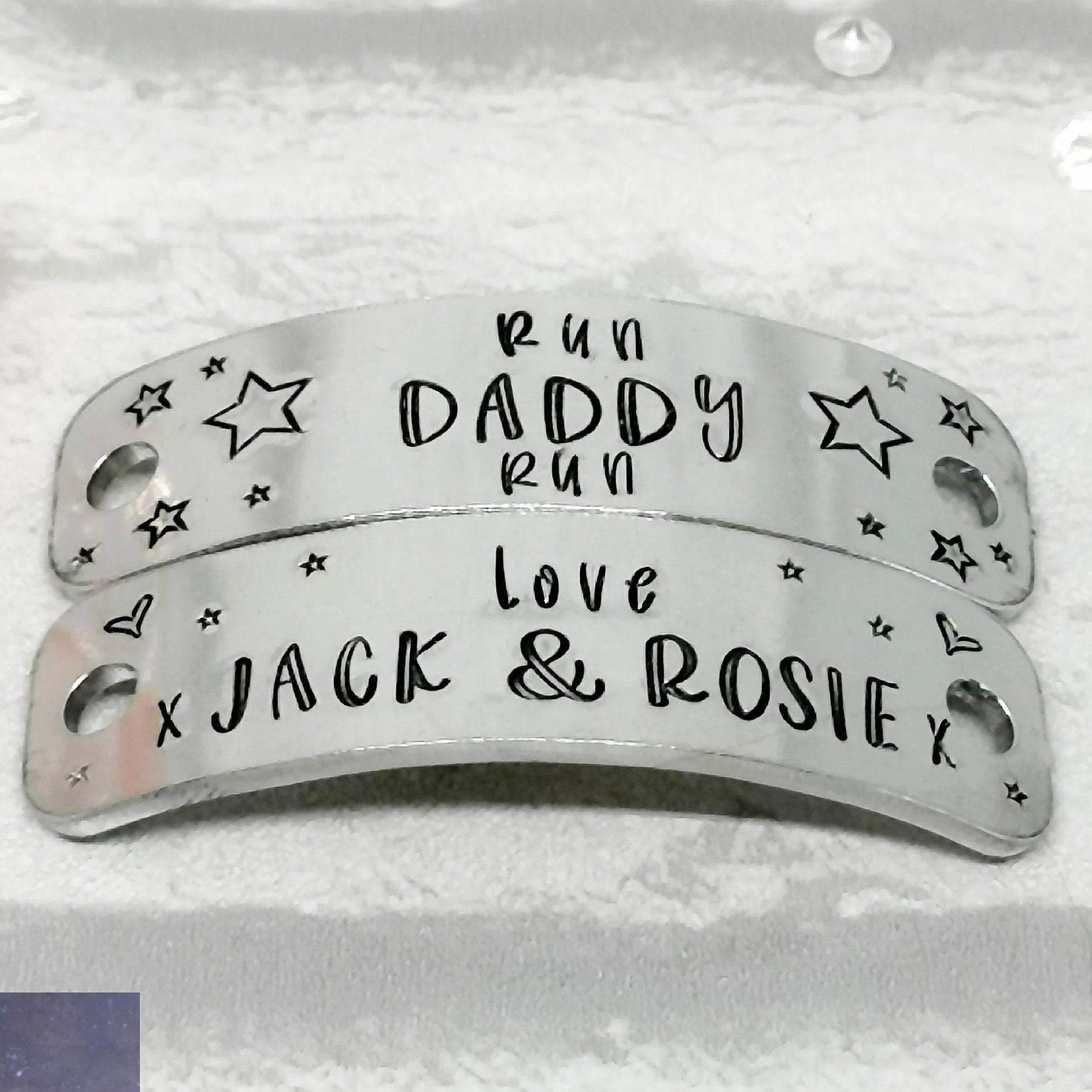 Trainer Tags hand-stamped with the quote RUN DADDY RUN / LOVE [NAME/NAMES], personalised with the names of your child/ren (up to 20 characters)