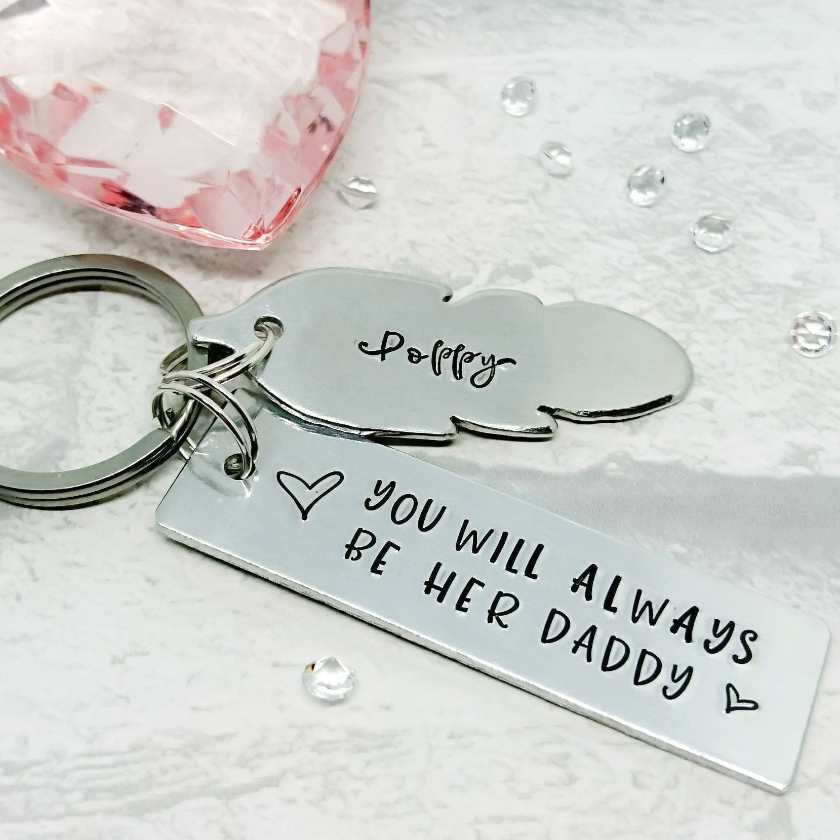 Hand-stamped Kayring with the quote YOU WILL ALWAYS BE MY/HER/HIS/THEIR DADDY with a feather charm(s) with Baby's name on.
